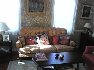中央の額絵は、ベルギー象徴派のジャン・デルヴィル作品。主題は古代ギリシアのデメテールを奉ったエレウシス。花々の影とギリシア建築が印象的。