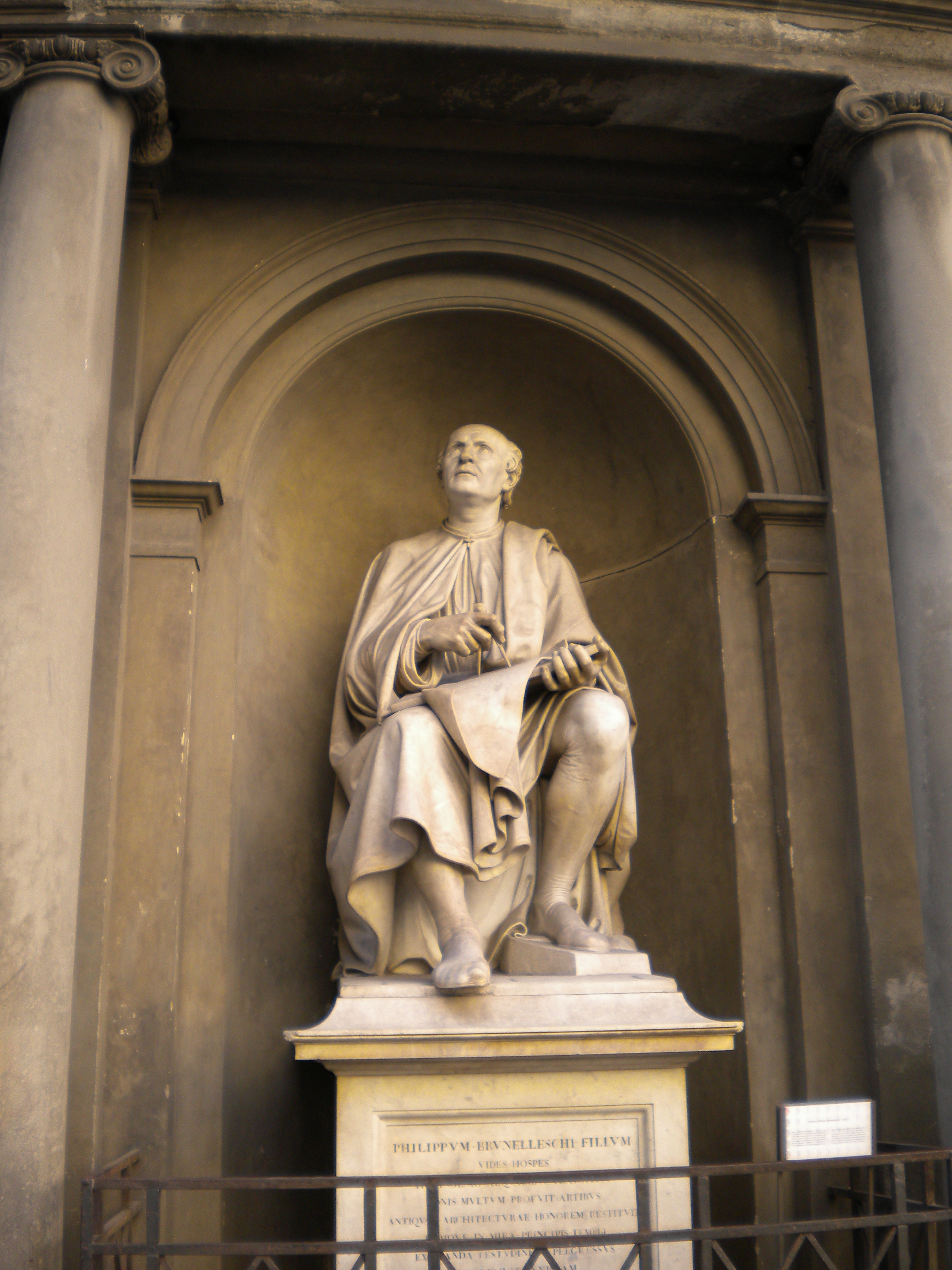 写真は、ドゥオーモ(サンタ・マリア・デル・フィオーレ)の広場に佇む、クーポラを見上げるブルネレスキの像。コンパスを手にしています。