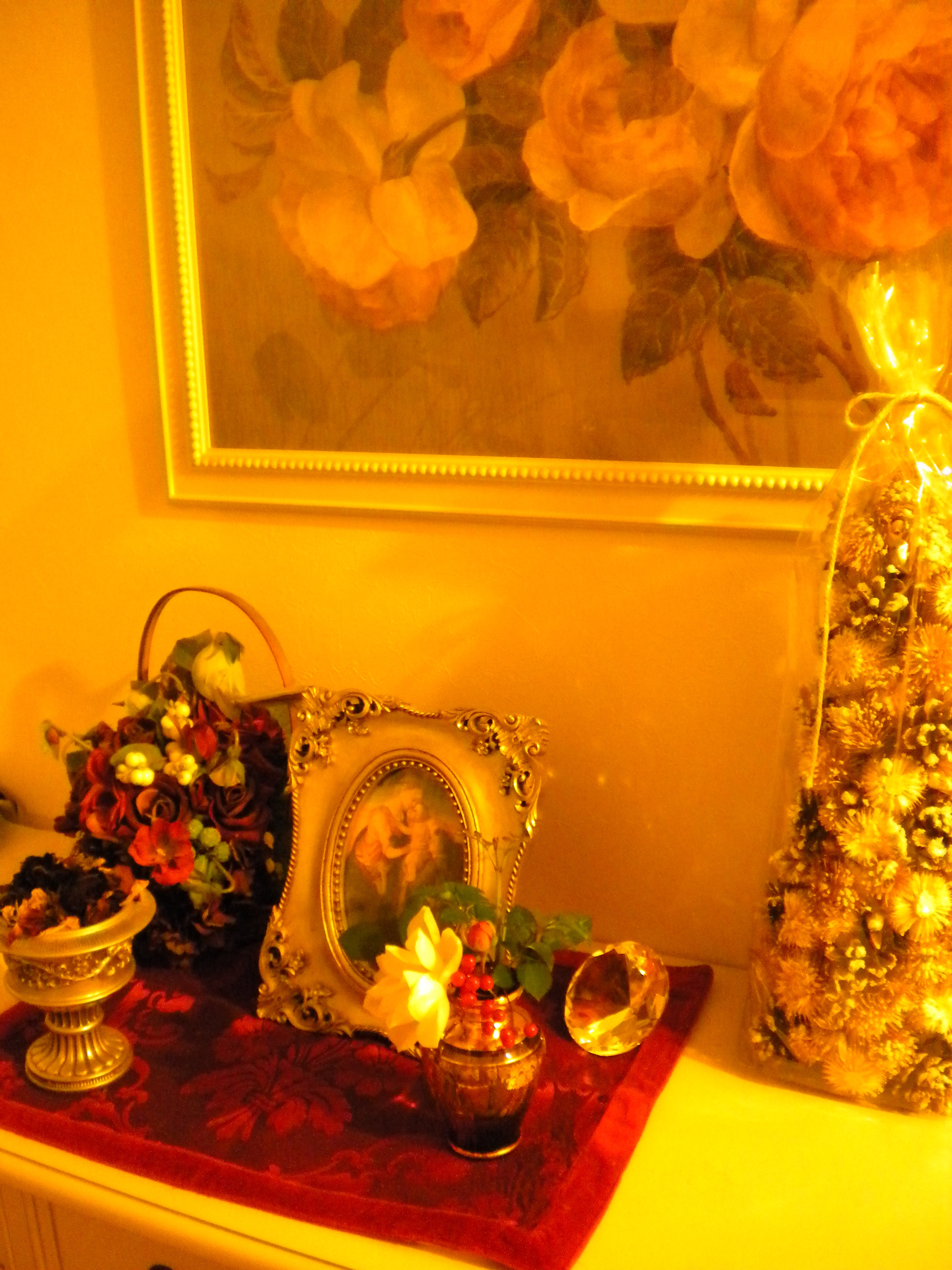 一応クリスマス仕様です。このほかに、バニティの飾りと絵、ダイニングのテレビボード(地デジ対応していません..薄型テレビだと上にディスプレイできないので/ずっとトラセリアのサミー・ベアとベア用のソファを置いているのです。TVもあまり観ない、といいますかバレエやクラシックのDVDや録画を見るくらいなので)の周りなどを少々模様替えしました。