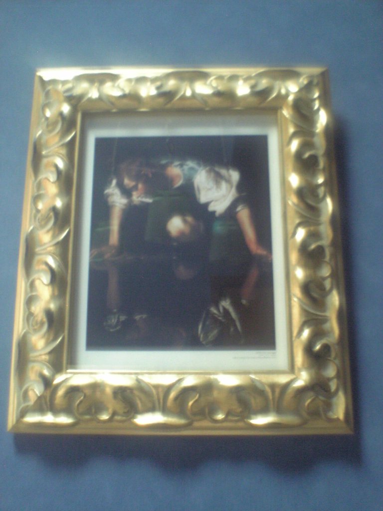 額縁のほうは、2001年イタリア年にあったカラバッジオ展で購入したナルシスの額絵。ルネサンス時代は、絵画・デッサンモデルは徒弟や弟子がしたといわれていますが、そうみてみると、ボッティチェリの絵画にもカラバッジオの絵画にも同じ人物がいるように思えます。ちなみにヴェロッキオのダビデは、徒弟だったレオナルドだといわれています。また最後の晩餐に描かれているヨハネは、やはりレオナルドの弟子だった人物といわれてもいます。