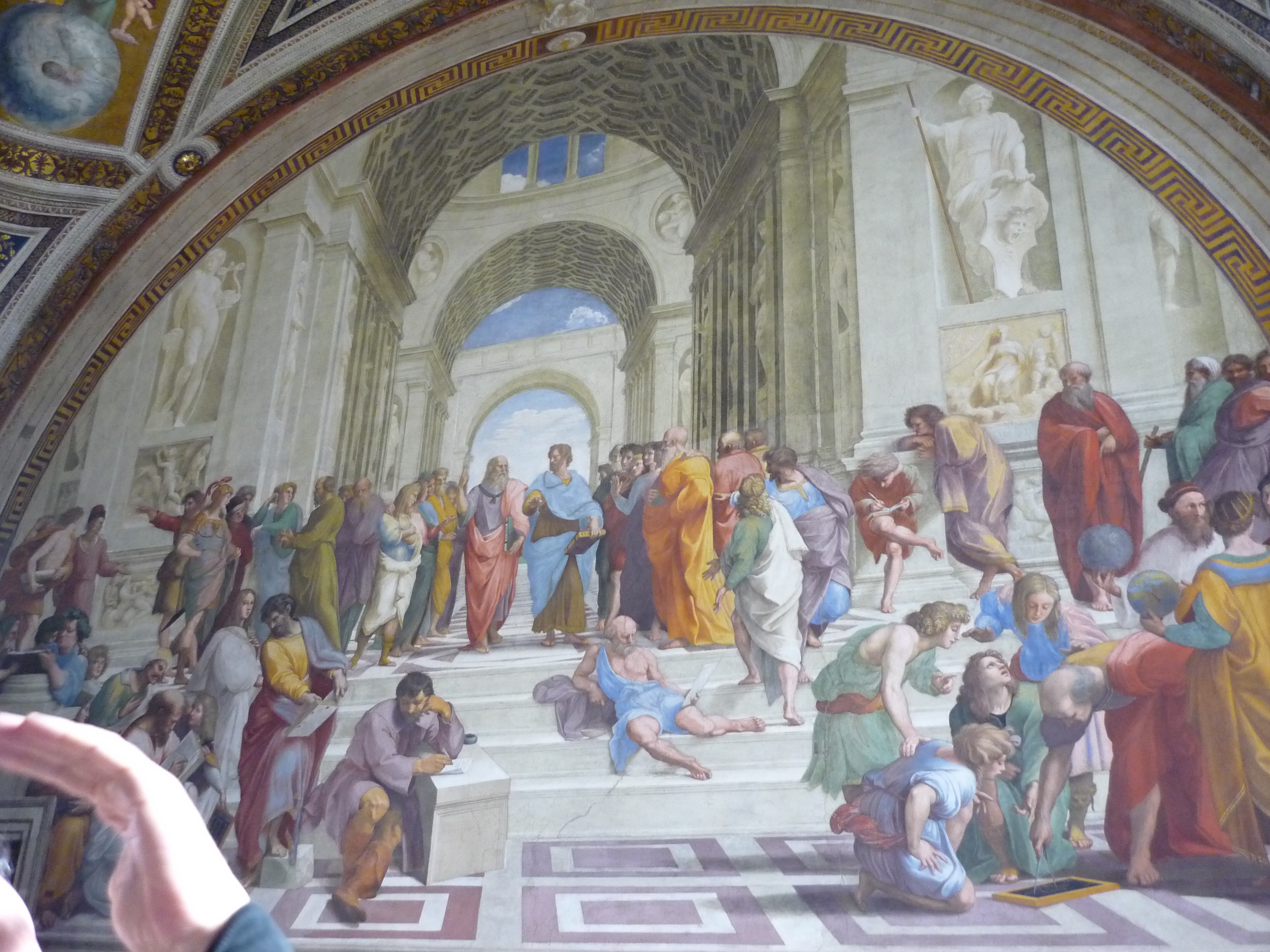 写真は以前に訪れた際の撮影した、ラファエロの「アテネの学堂」(ヴァチカン)です.ヴァチカンのレオ10世の装飾(フレスコなど)は、フィレンツェのヴェッキオ宮と類似した部分があると感じます。カリオペの書斎や四元素の間などなど...ちなみにラファエロがヴァチカンの装飾責任者に選ばれたのは、やはり装飾品や調度品の質感、服飾の素材感などを絵画で詳細を描きながら自然な絵画を描けることがポイントだったようです。
