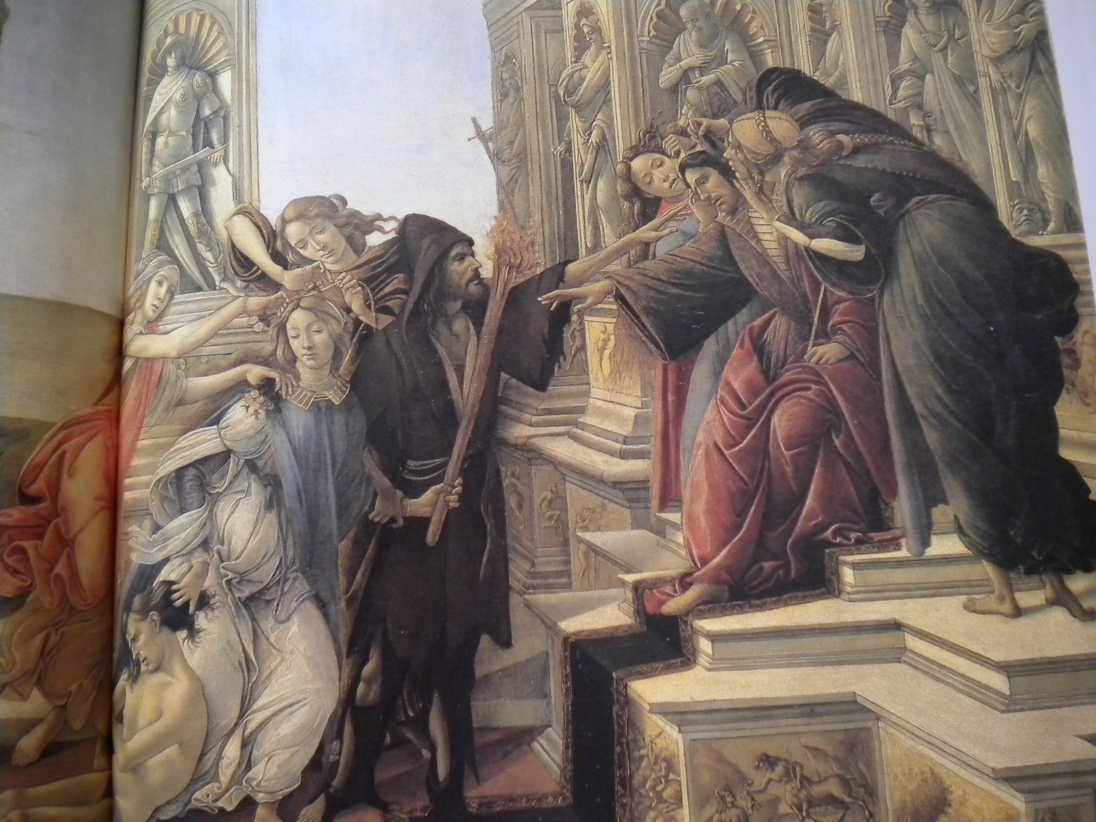 ボッティチェリは「憎悪」や「羨望」や「嫉妬」などあらゆる悪徳を目に見える形で描きました。「真理」を忌々しげに見上げる「悛悟」の寓意、また「欺瞞」「嫉妬」「誹謗」が「無実」の人を「不正」な審問官の前に引きずり出すというあの、「アベレスの『誹謗』」(ウフィッツィ美術館にある・ボッティチェリの絵では小さい絵、しかし「春」と同様に絵自体が語りだす絵画です)に描かれた社会・世界とおなじものが世の中には蔓延しているのではないでしょうか。現代ではさらに、それらが「自由」という言葉のままに振舞っているのではないでしょうか...。ボッティチェリの描く「不正」には「無知」と「猜疑」がヒステリックに何事か(つまり無知と猜疑に満ちた言葉を)を吹き込んでいるのですが、どこか現代の社会でも同じ構図が人を生き難くしているように思えてしまいます。