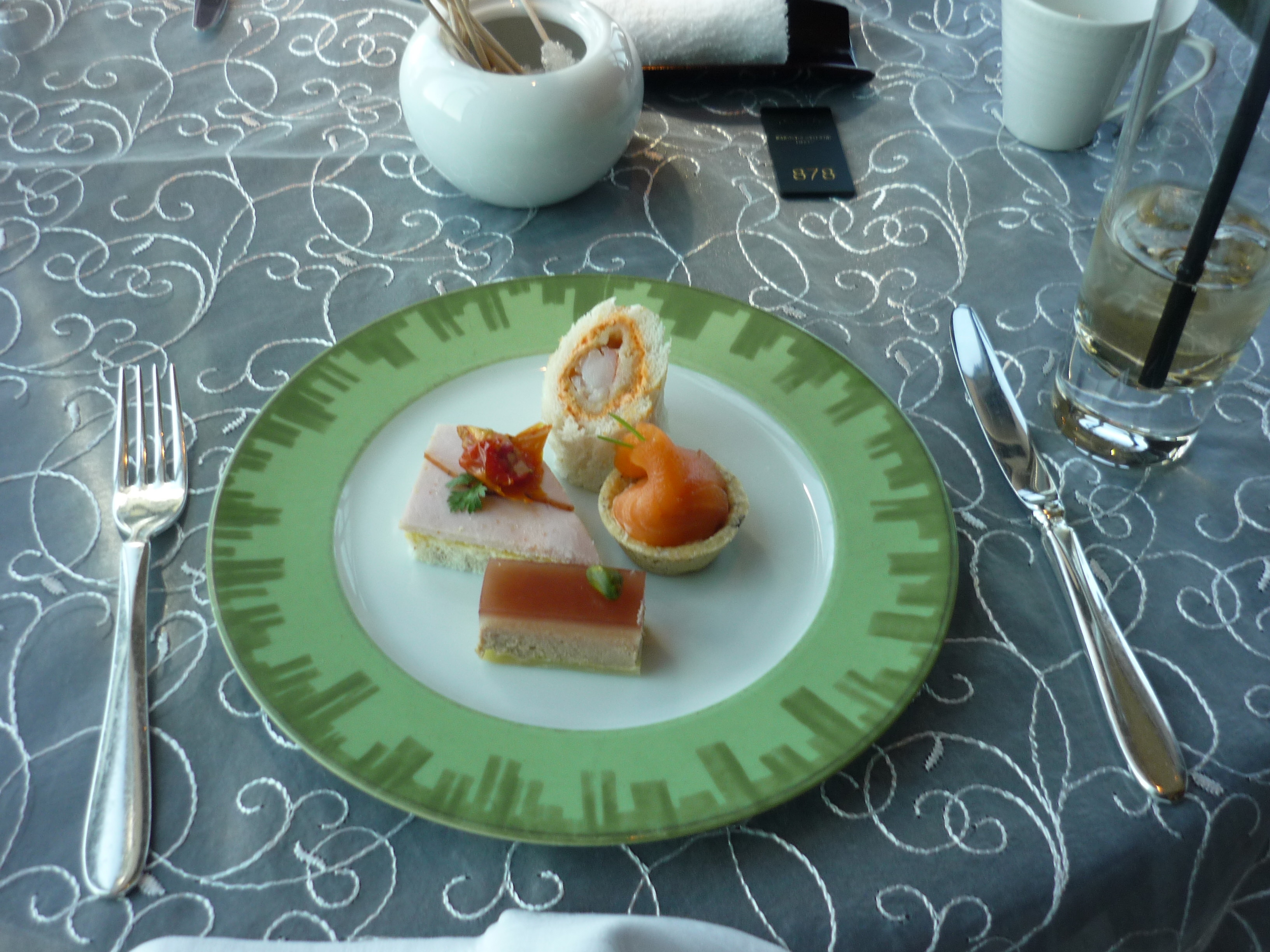 第一の皿、フォアグラ、海老のロールサンドほか一口でいただけるオードヴル。