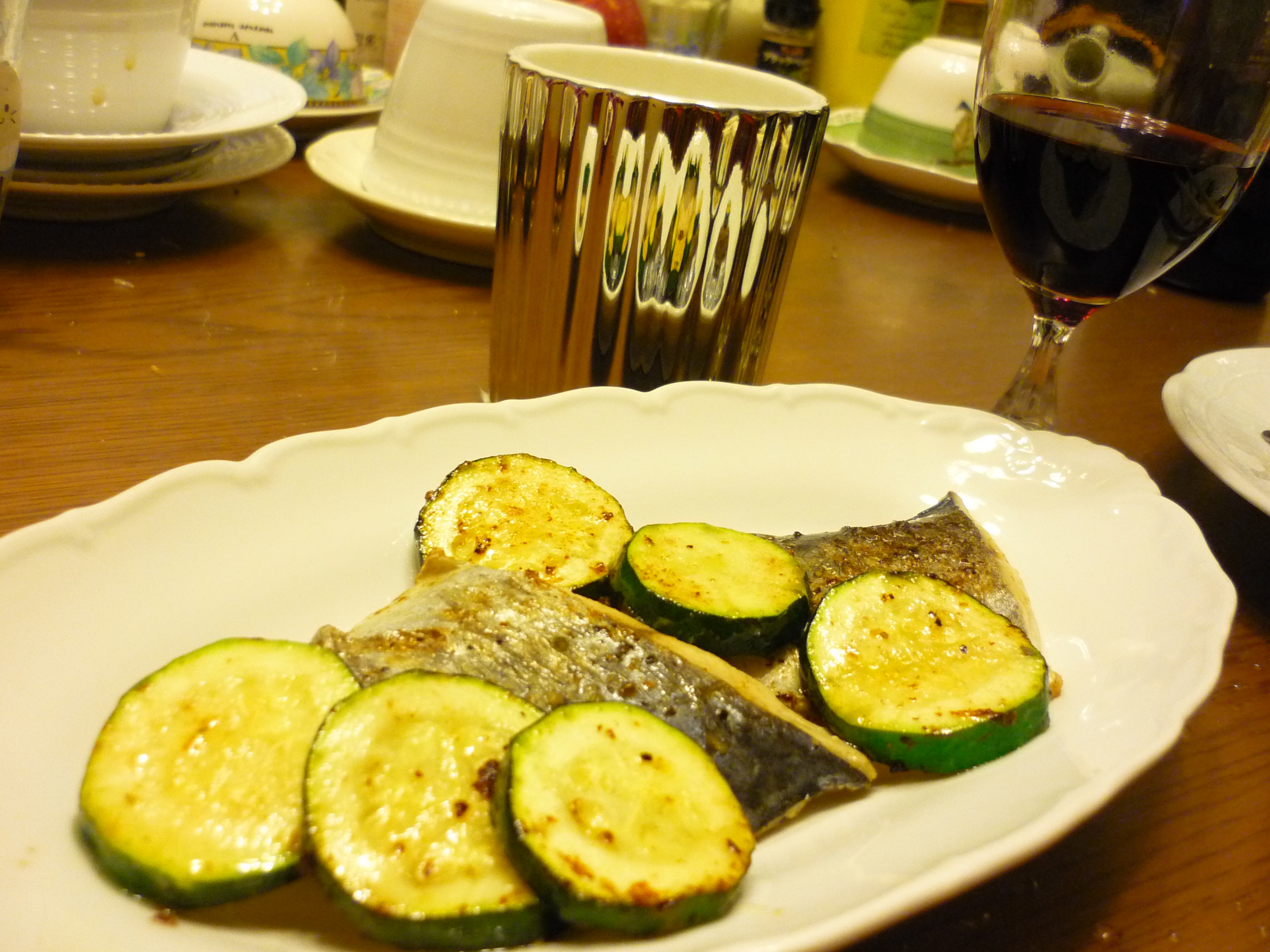 ゲランドの塩、オレガノ、しょうゆ少々でシンプルに焼き、つけあわせはズッキーニです。これにパンと野菜スープ。