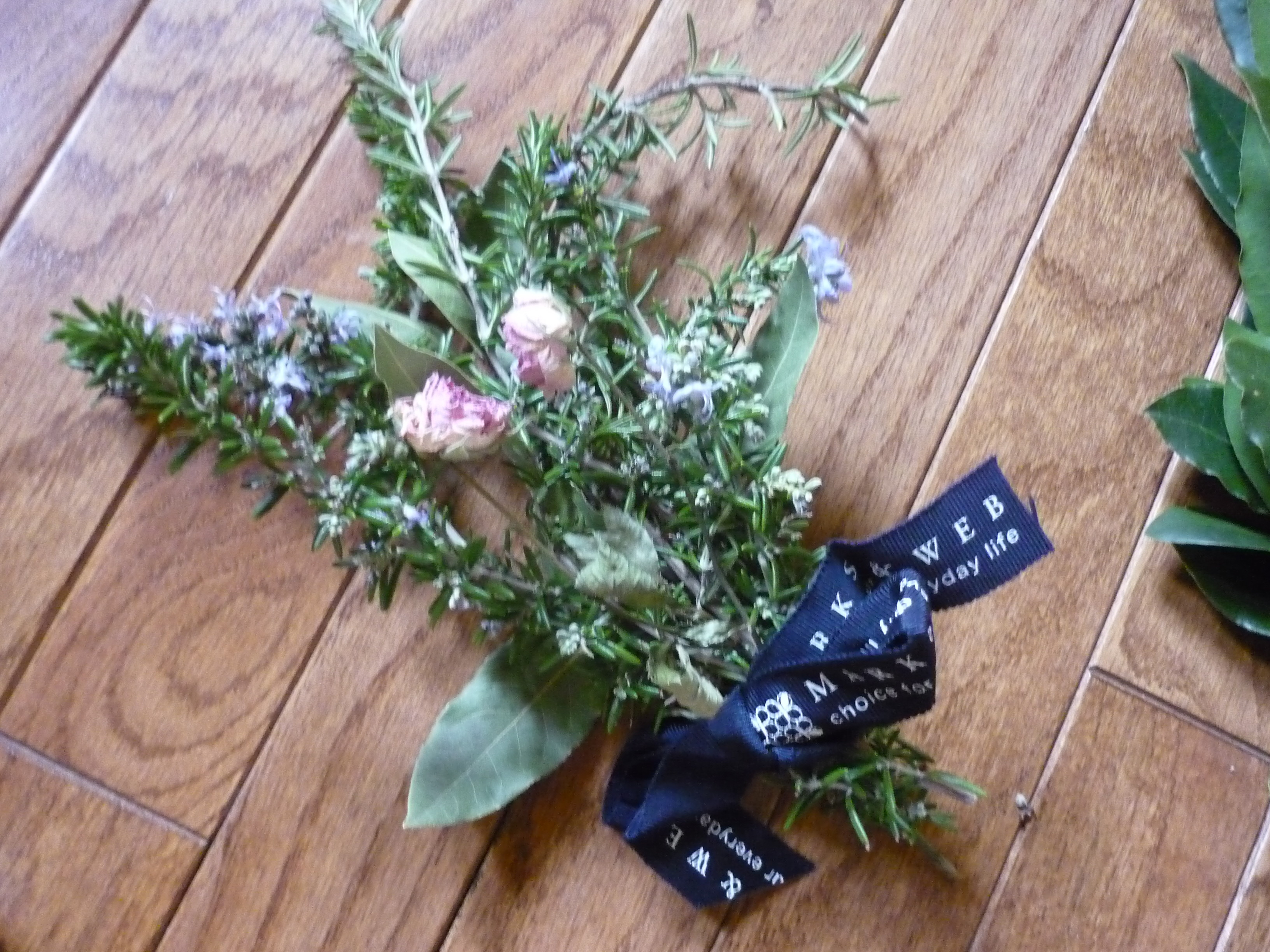 写真は、車のフロントにのせるために造った小さいローズマリーのブーケ。