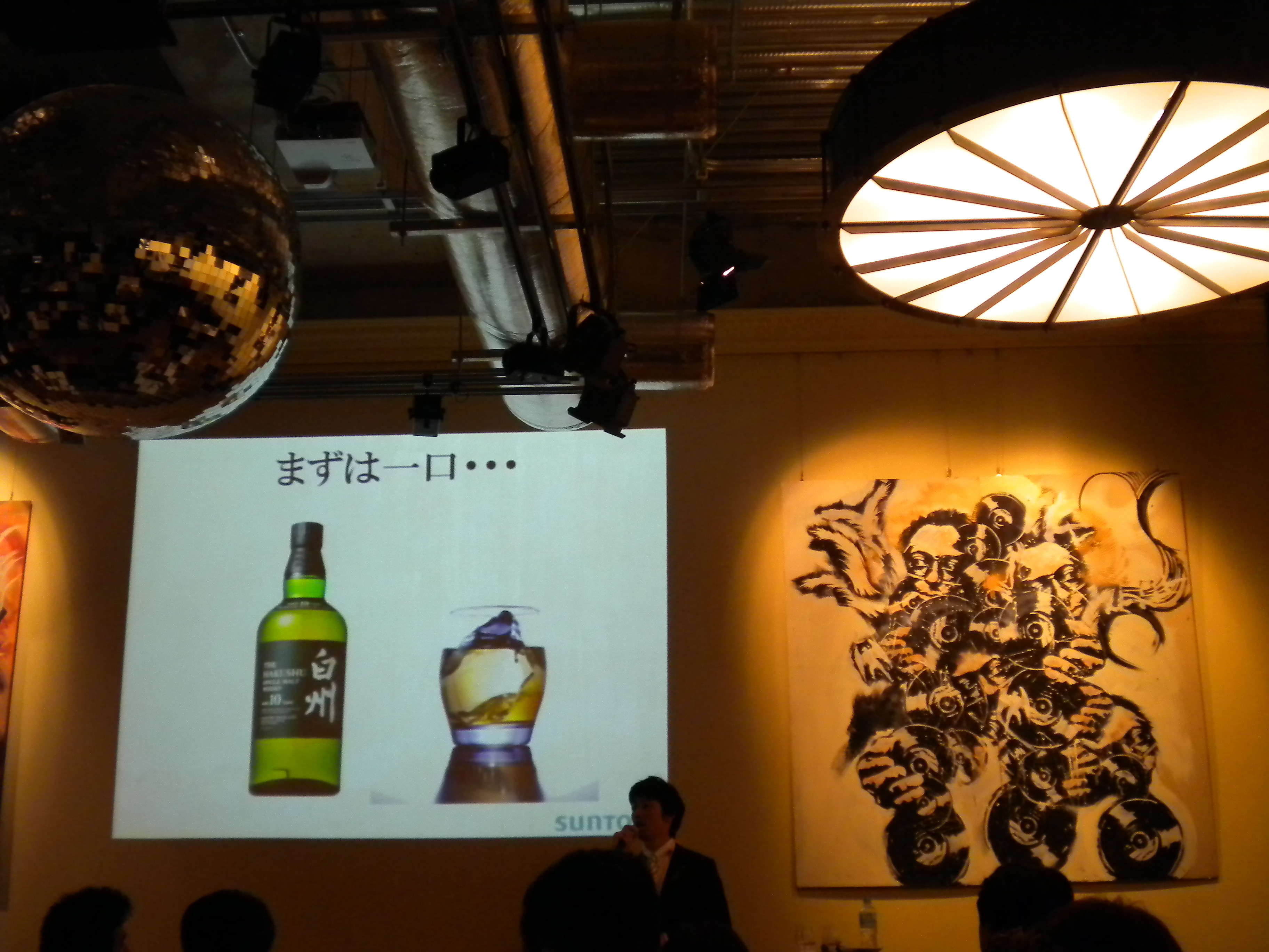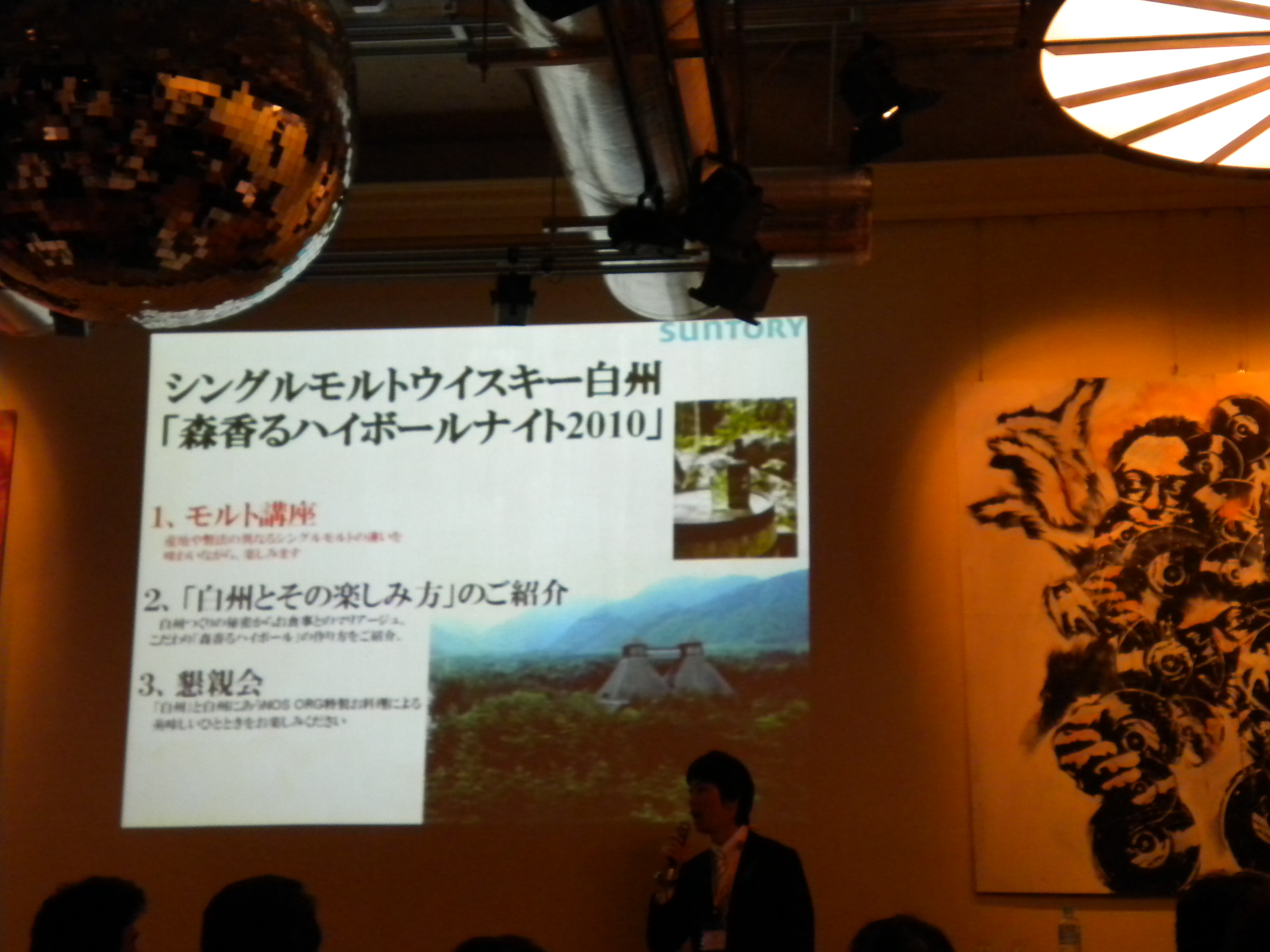 19:30にスタートしたイベントでは、まず、ピュア・モルト・ウィスキーについて、説明がありました。このあたりは白州の蒸留所にいくと実際の工程や香り、樽の歴史などみることができますし、それを思い出しました。
