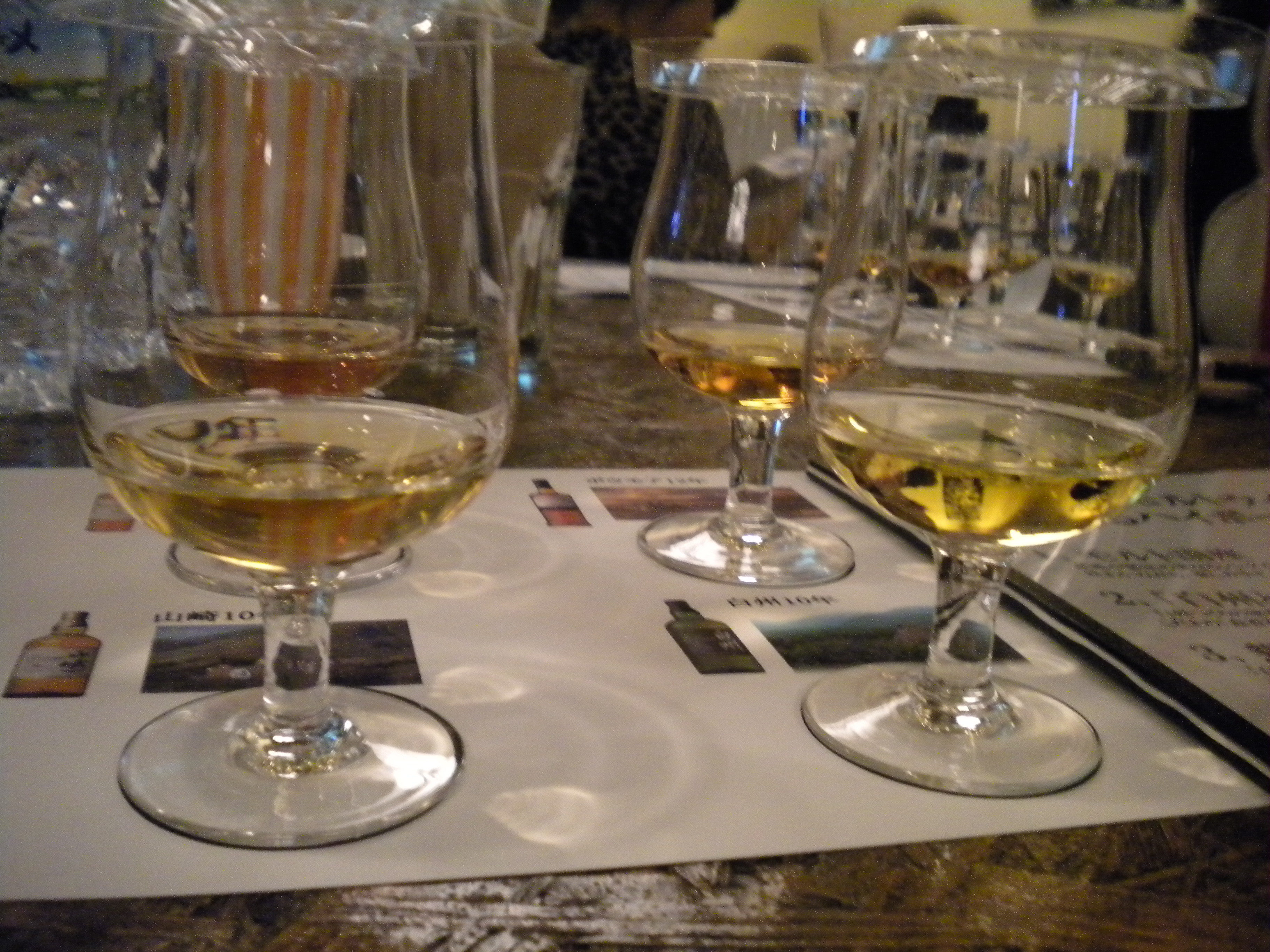 4種類のピュアモルト、マッカラン、ボウモア、山崎、白州をテイスティング。テイスティングのグラスは白州のものと一緒でした。1:1になるように加水したほうが、香りと味をよりわかりやすくしてくれるとのことです。
