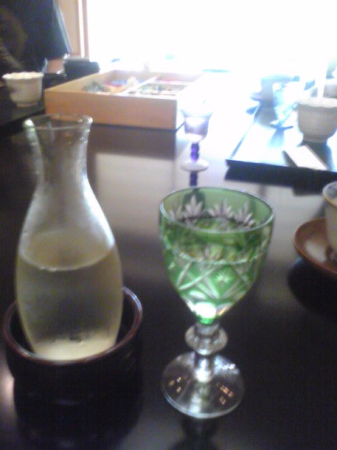 緑の切子グラスにしてみました。アールヌーヴォー調のものもあったり、散々迷いましたが、脚付きのグラスが涼しげ。