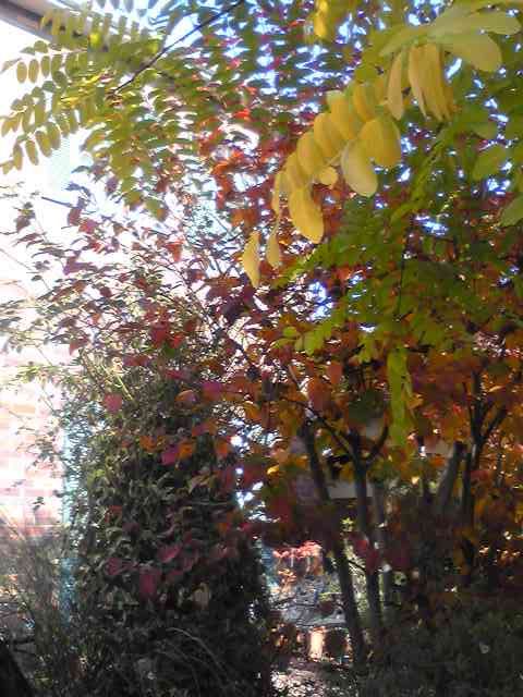 しばしば「何の木ですか」ときかれることもあるゴールデン・アカシア、その奥のやまぼうし、ハゼも紅葉。