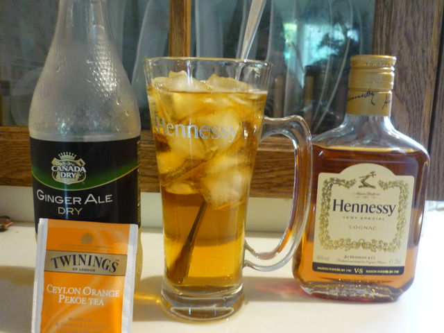 昔、表参道にFLOのブラッスリーがあったときに、クレーム・ド・カシスとアールグレイを使った食前酒をサービスしてもらったことがあり、私はもともと紅茶好きでもあるので、セミナーでいただいたタンブラーやレシピを参考にして、「ヘネシー+アイスティ+ジンジャーエール」のミキシング・ドリンクを作ってみました。