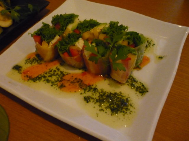 カマンベール、スモークサーモンとアボカドの生春巻き。