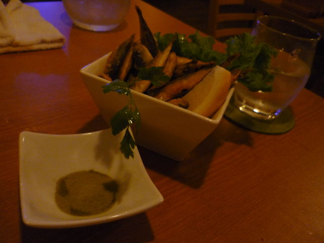 豆アジのから揚げ。抹茶塩でいただきますが、とてもおいしい。