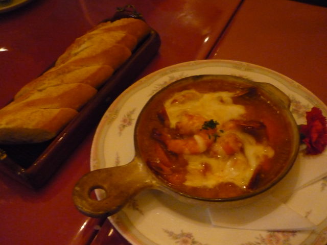 マイカのマダムが娘におすすめしてくださったエビとトマトとチーズのメイン料理。