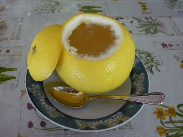グレープフルーツをくりぬいたなかに入っているゼリーを頂きました。美味。