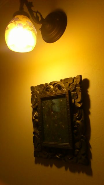 ウブドのミニアチュール風景画、今は古賀さんのテンペラ画を二階のにこさんコーナーに掛けていますので、ガレ(レプリカですが・・・ブラケットはガレと決めてました)のランプの下に。(※省エネしているのでガレなのですが、白熱灯色の蛍光灯・・・です・・・)