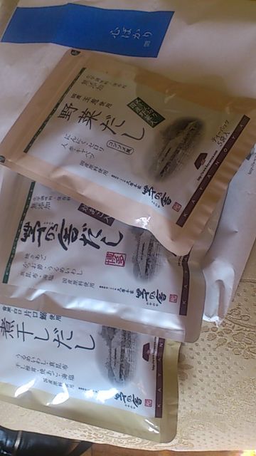 みゆきさんから、かやのやだしのあごだし、煮干しだし、やさいだしを頂きました。