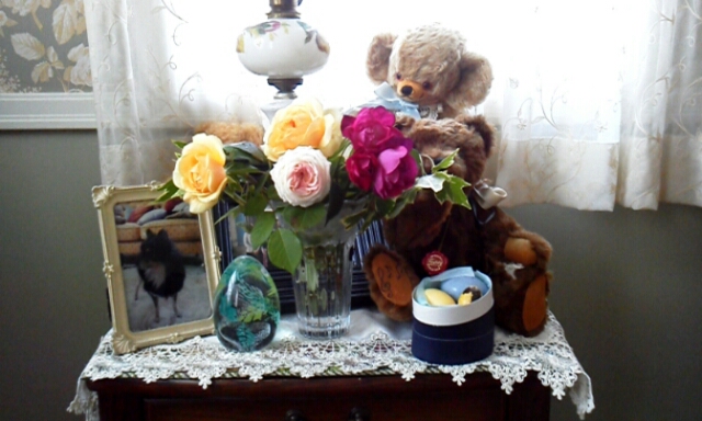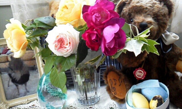 イングリッシュ・ローズを数種類活けました。ハーマンとメリーソートのテディベアが好きです。ハーマンのはオルゴール入り。