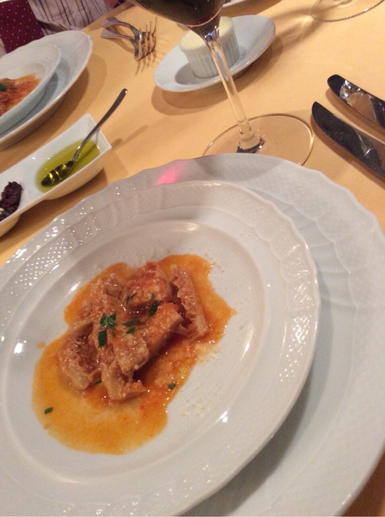 あたたかい前菜としてのトリッパの煮込み。美味しいです。