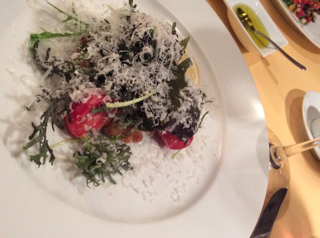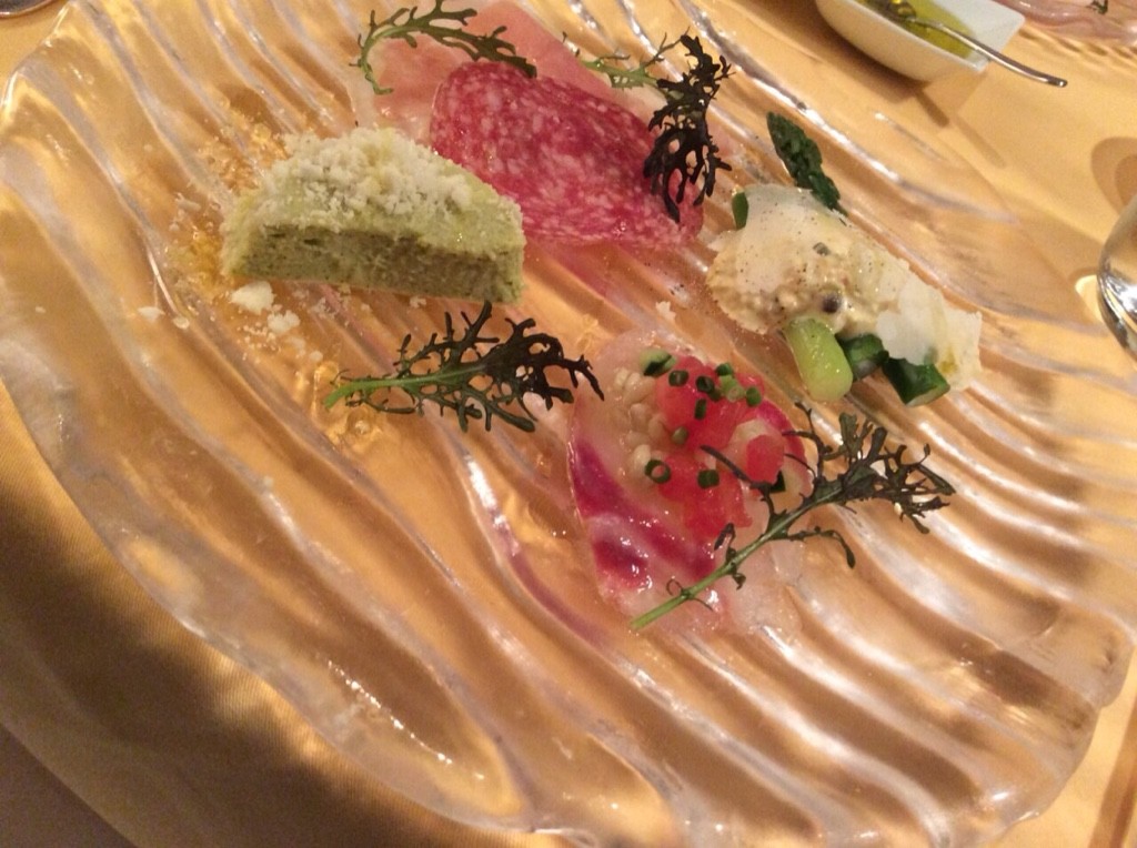 この前菜の前に、イタリアリストランテでは定番の、シェフからのお楽しみ前菜、アミューズがでます。ゴルゴンゾラのムース、とトリュフのオイル、はちみつ等々を使ったもので、これもとても美味しくて、期待が高まってしまった。たまにはこういう自分で作れない料理を頂くのは重要です。