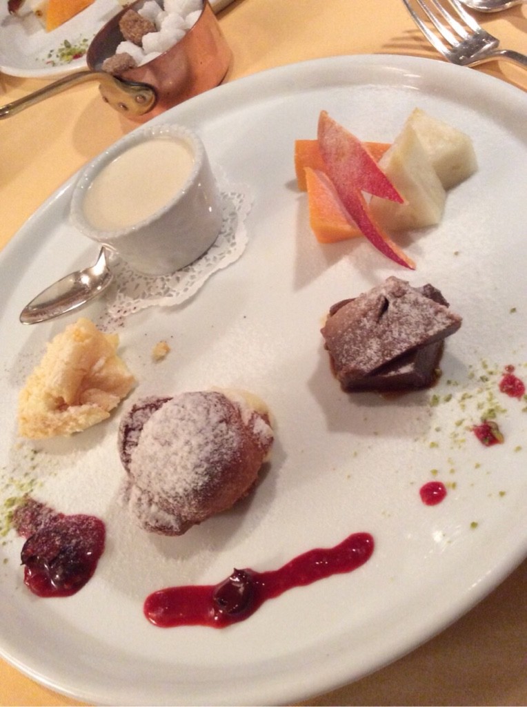 私はコーヒー風味のパンナコッタ、マルサラ酒でかおりづけしたシュークリーム、カットしたフルーツのマンゴーとパイナップル、マスカルポーネのチーズケーキ、チョコレート・プディングをチョイス。