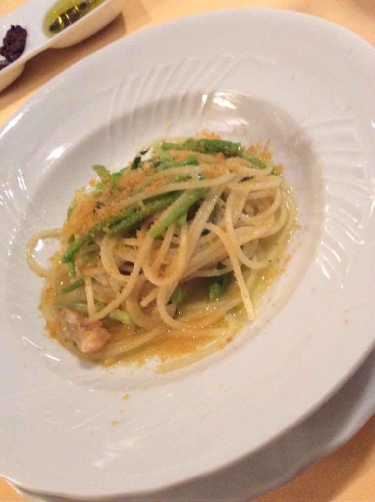 からすみとアスパラソバージュのオイルベーススパゲティーニ!
