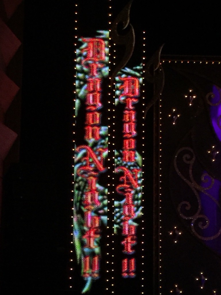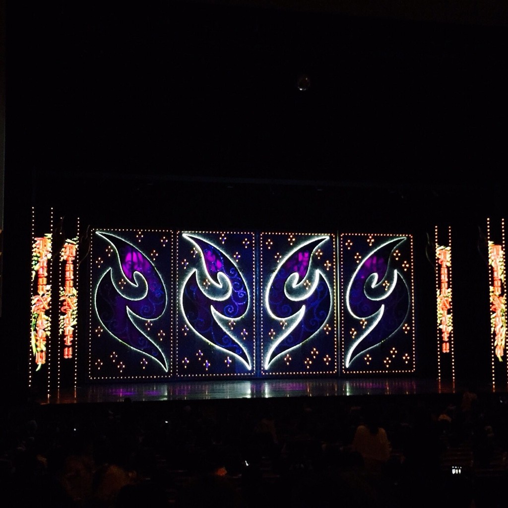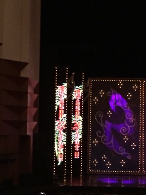 大波のSEで時間が告げられ次の場に!いやいいコーナーでした。この場面のバックの背景画面もきれいでした。ACT2ではあてもの(?)ようするに袖の部分の仮柱にDragon Night!と照明モニターで飾られているのですが、色が白に変わりました。照明と音響がよくて、コンサートショウという感じです。