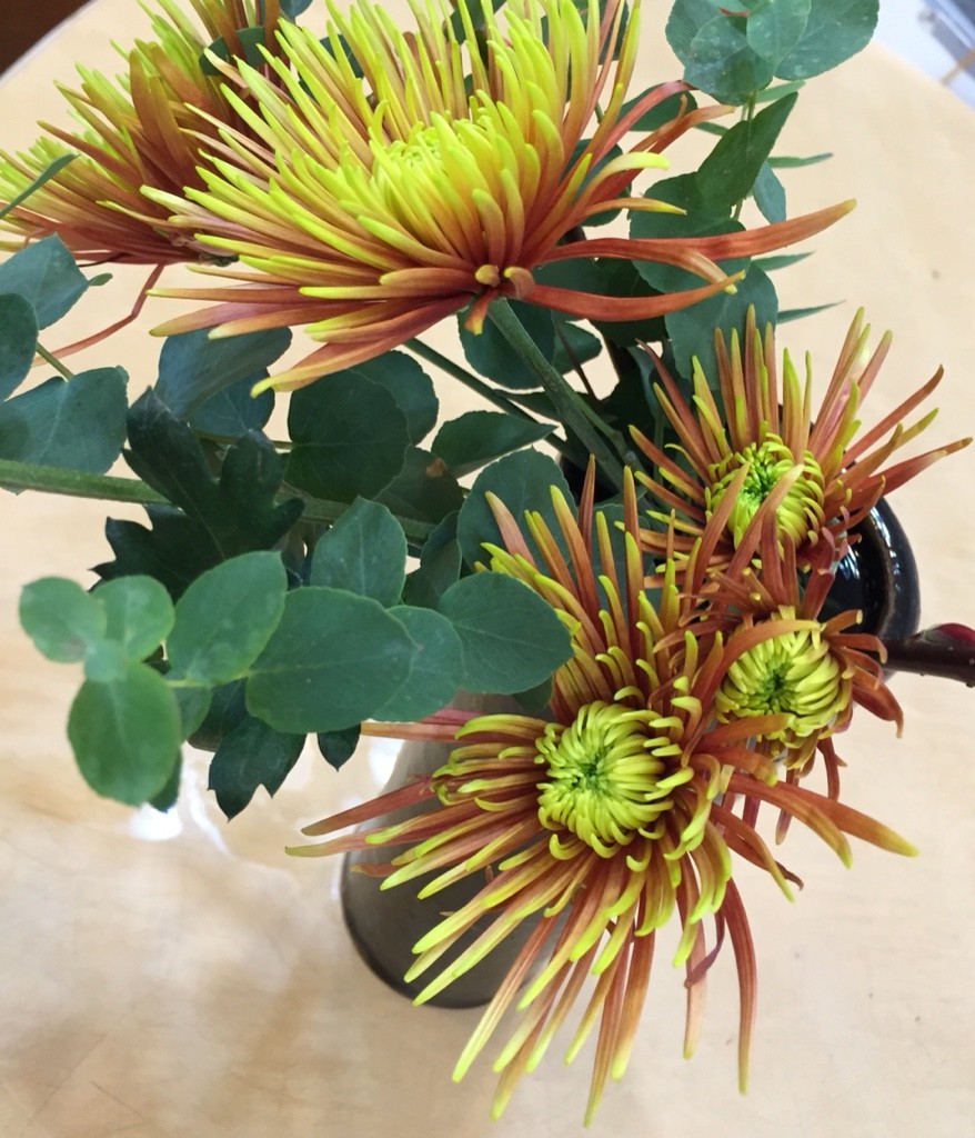 菊の名前は確かサフィーナ。ユーカリと色が調和します。選らんでよかった。