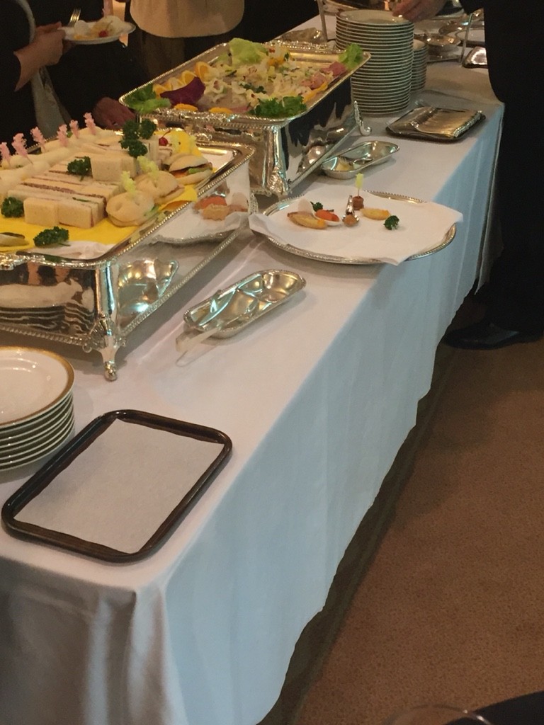 立食はよく経験するので、スパークリングワインとスパークリングのお水、もし前菜に列ができるなら、フィンガータイプの前菜は上のドリンク2種と一緒にむしろ配ってしまったほうがスマートかな、とそこだけ気になりました。