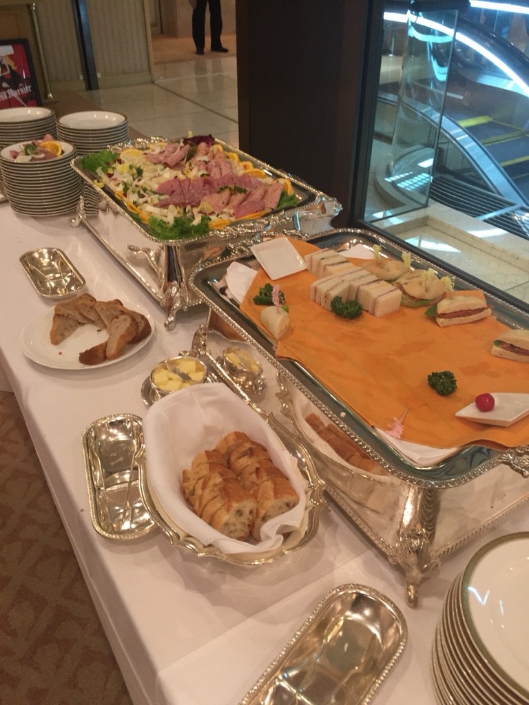 前菜、サンドイッチ、ミートローフ、ローストチキン、味な何種かあるフェトチーネ?太さのあるロングパスタ、マカロニグラタン(牡蠣入りだったか)海老ピラフ(このピラフと添えられたソースがとても美味しかった・・・家でつくろときもこの味を目指して作りたいと思います。パウンドケーキ、Cafe、紅茶。ドリンクが、スパークリングワイン、赤白ワイン、ソフトドリンクは別カウンターでした。