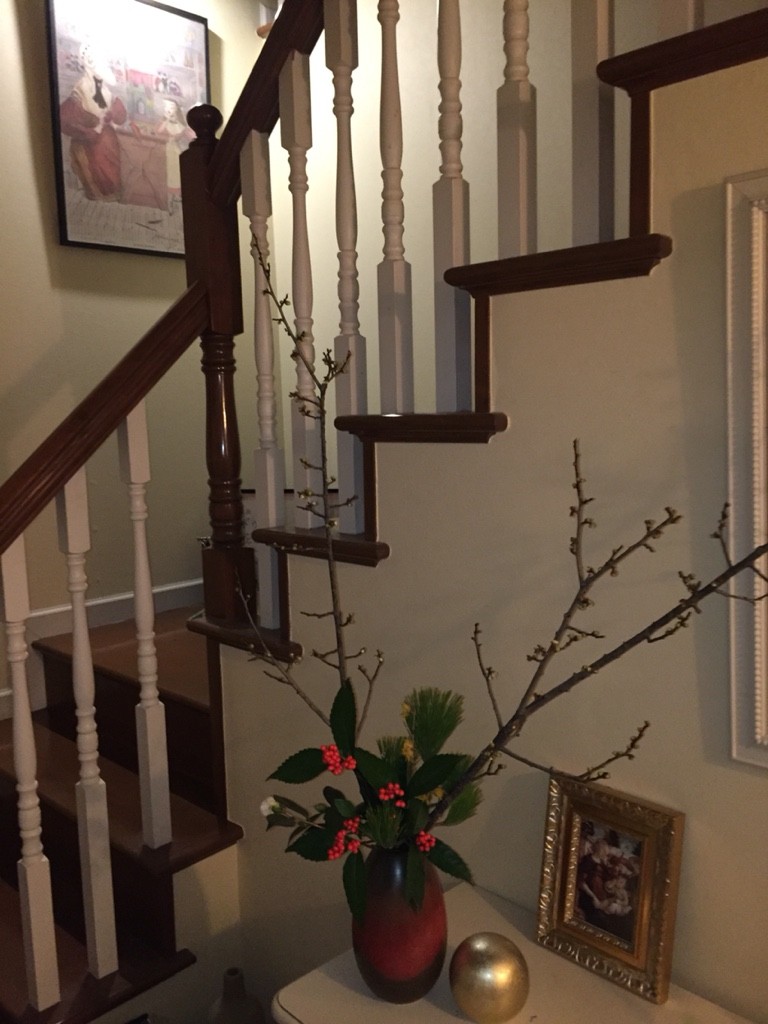 つぼ型の花器にいけてみたくて頑張りました。いけたとたんに水を吸い上げて蕾が開いてきたようです、今朝はもっと咲いてきて元旦の朝には白い梅の花が観られるのでは...