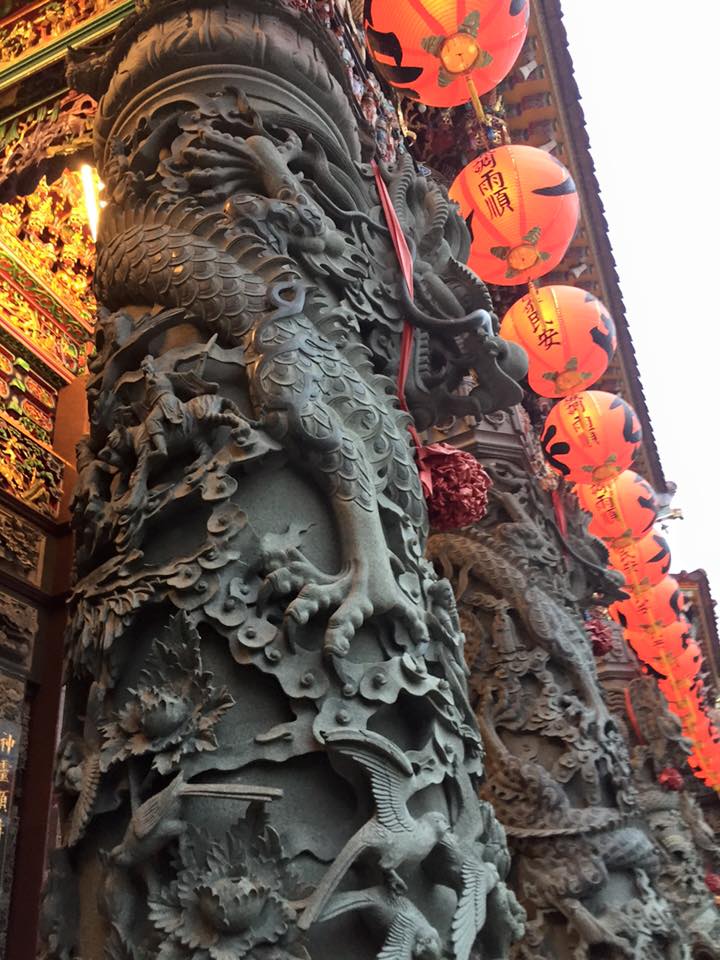入口の柱も手彫りです。凄いマニエラな龍や鳥のモチーフ。龍の手は3本が庶民、4本が諸侯武人、5本が皇帝と故宮博物館で知った気がするのですがこのりゅは4指が四本でしょうか。