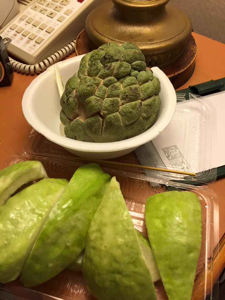昼間のお寺の前でフルーツ屋台が出ていたので買った(買ったよ)シュガーアップル。正式には釈迦頭。
