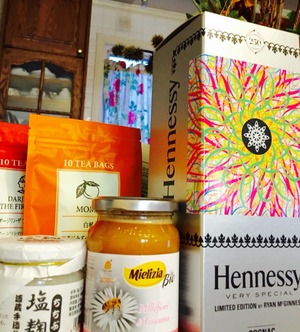 みゆきさんから、ヘネシー限定ボックスとトスカーナの蜂蜜、秩父の塩麹、ルピシアの紅茶2種いただきました!