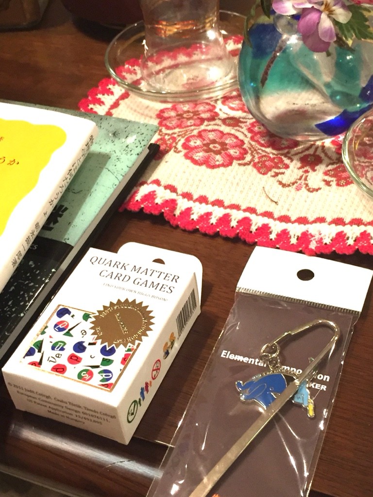 小又先生から頂いた筑波のクォークのゲームカード。ハンガリーの中学生が考案したゲーム(神経衰弱的なルール)。カードデザインがおしゃれ。ヒギンズの紅茶も小又先生から頂戴しました。