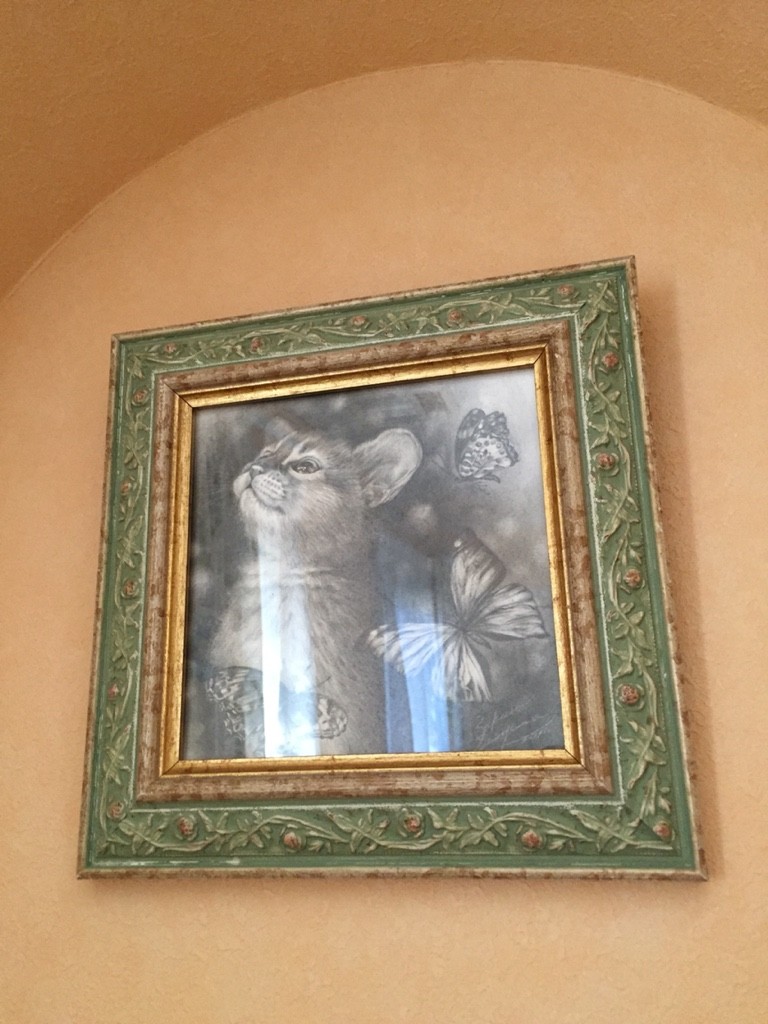 2階の部屋にかけている中井さんの鉛筆画"夢寝子(ゆめねこ)"