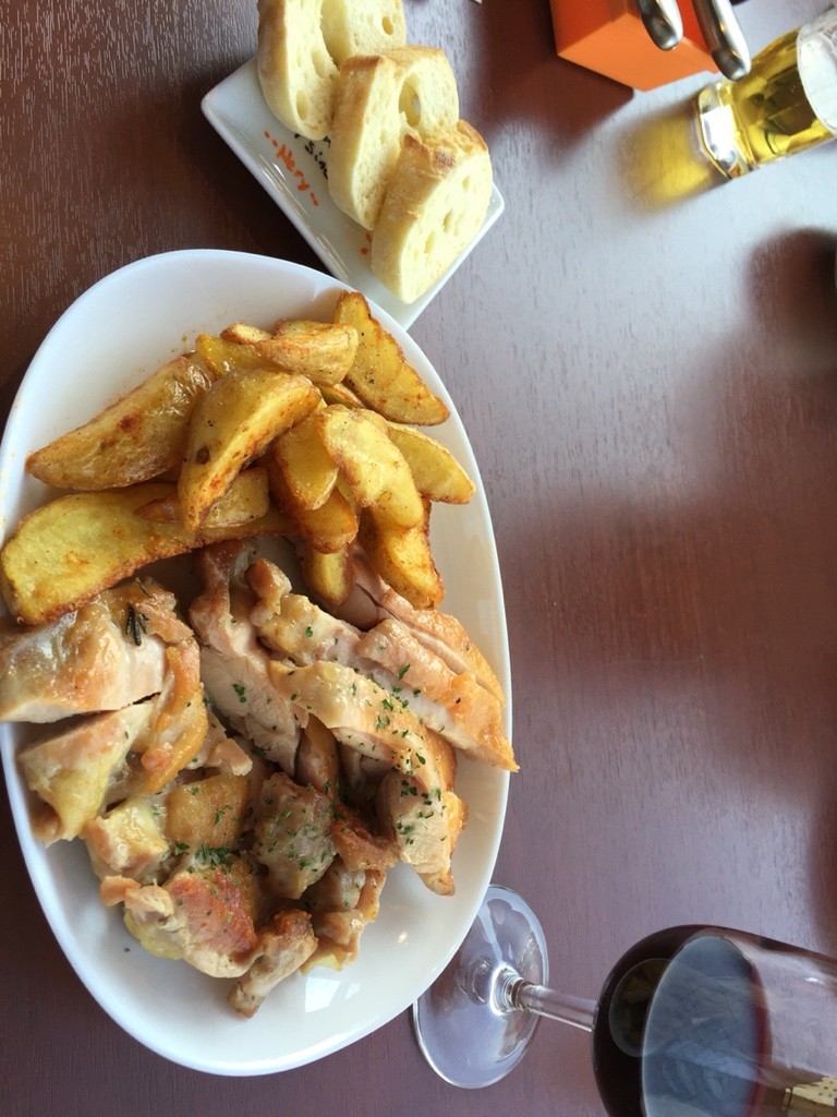 ランチ4種のうちAのローズマリー風味に。シンプルですが肉の臭みがまったくなくやわらかいオーブン焼きでした。パンが付きます。私はランチワイン。サングリアもあったので次はサングリアにしたいと思います。