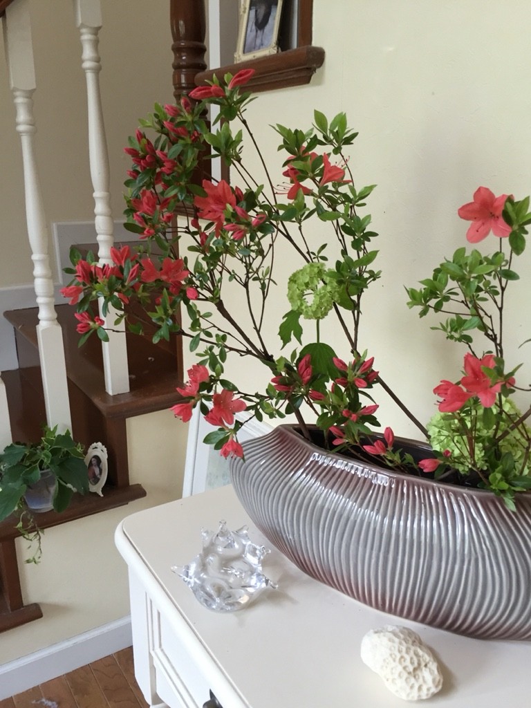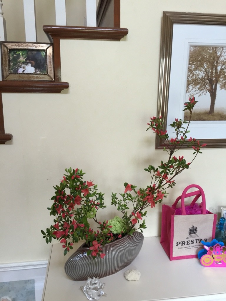 日曜のお稽古(草月流)の自由花を自宅でいけなおした状態です。