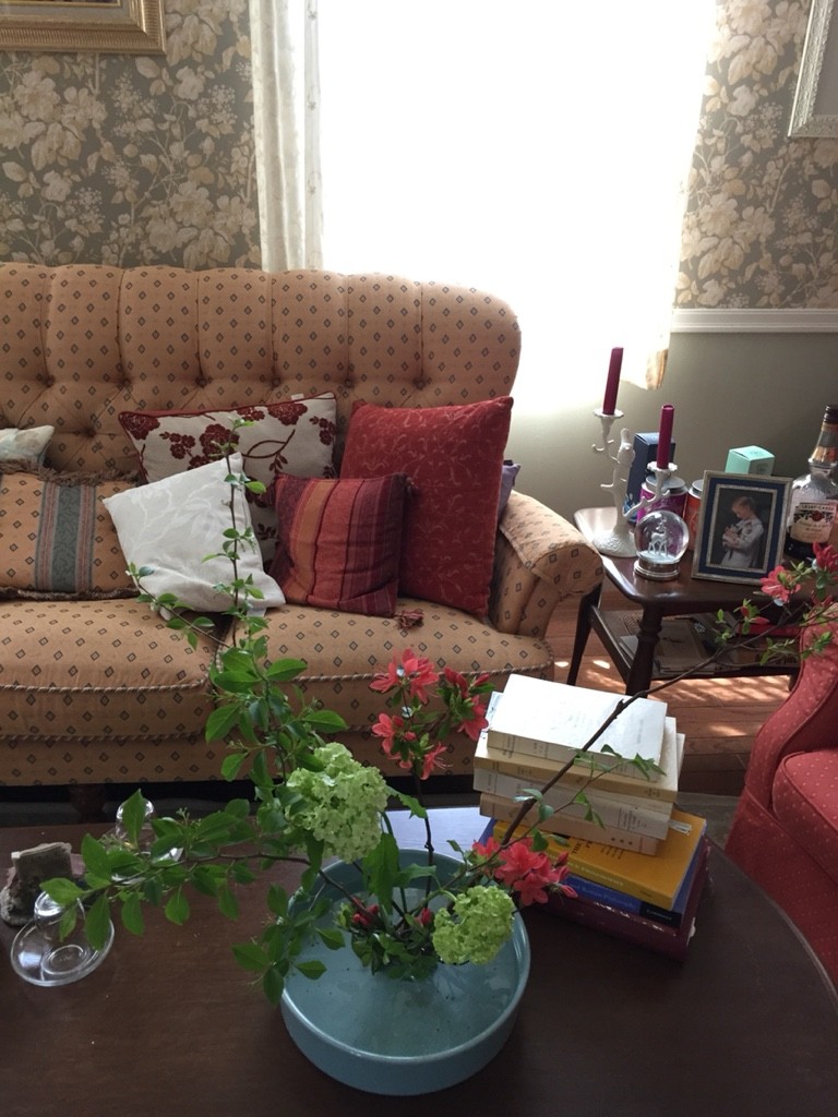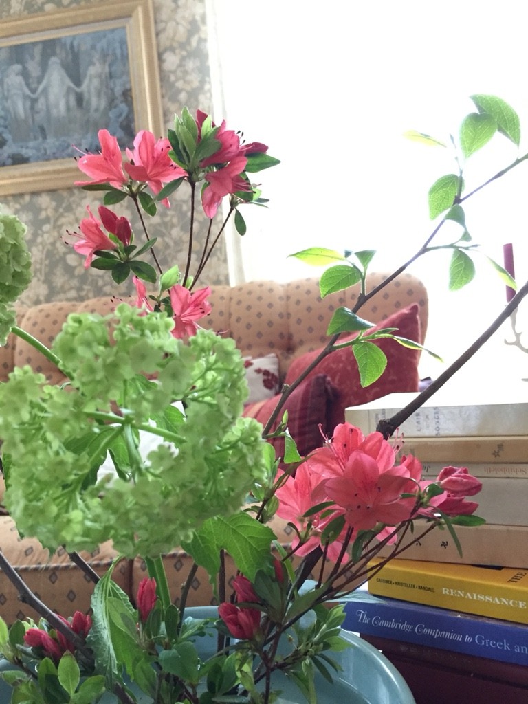 新緑が美しい季節になりました。写真はとってませんが、ダイニングテーブルの上には、ビバーナムと庭のエゴの木の枝をガラスの花瓶にいけています。