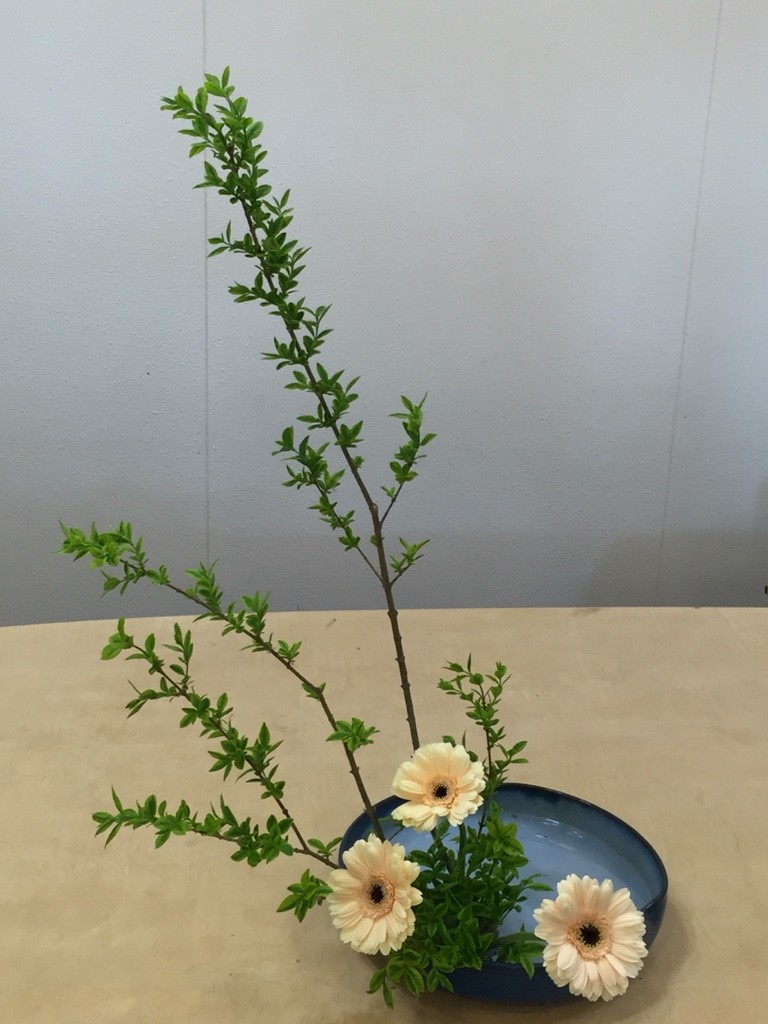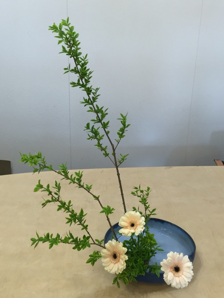新緑のいぼたにガーベラを合わせて、花型法の復習をしました。