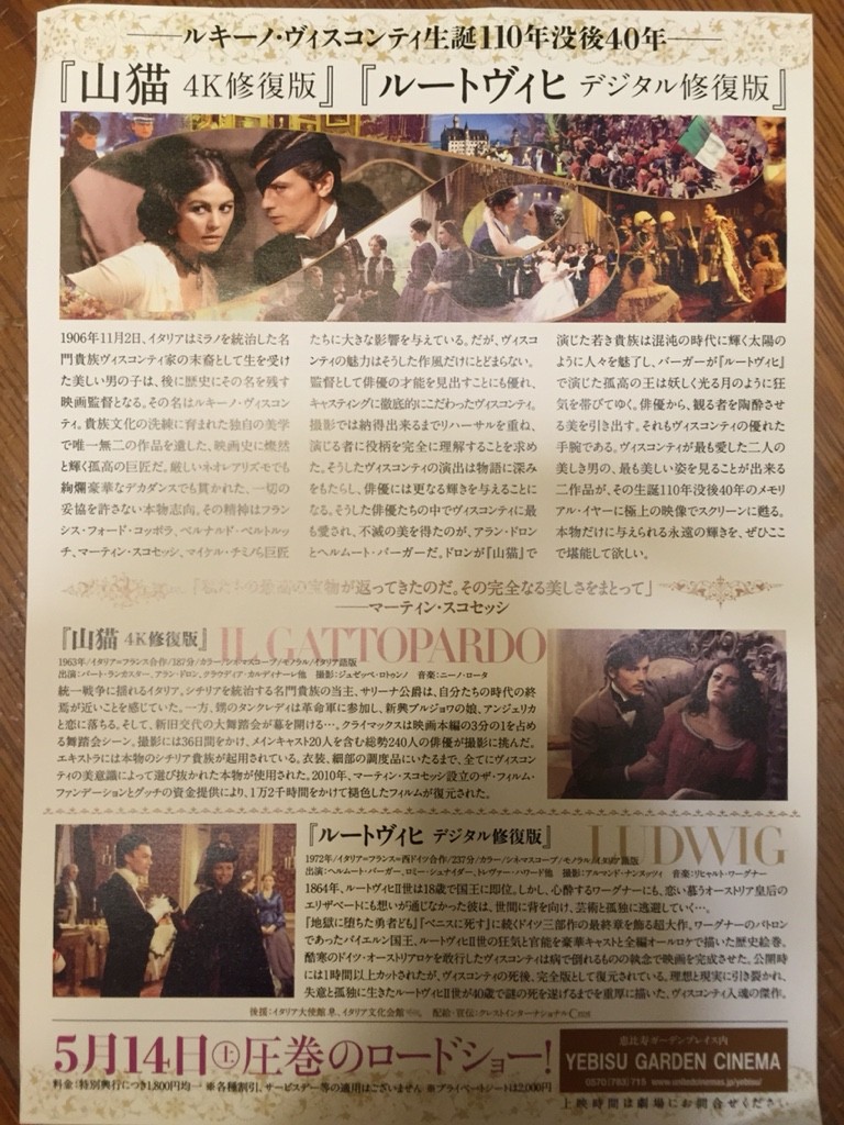 恵比寿ガーデンシネマでは、上に掲載したフライヤーにある「ルードヴィヒ」「山猫」の2作品をデジタル4K修復完全版(削除された1時間あまりのシーンも含まれる!)を5月14日より上映するとのことです。