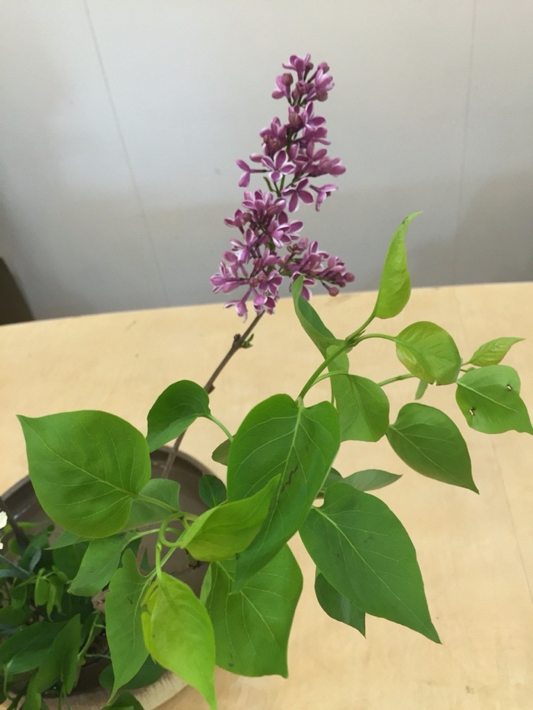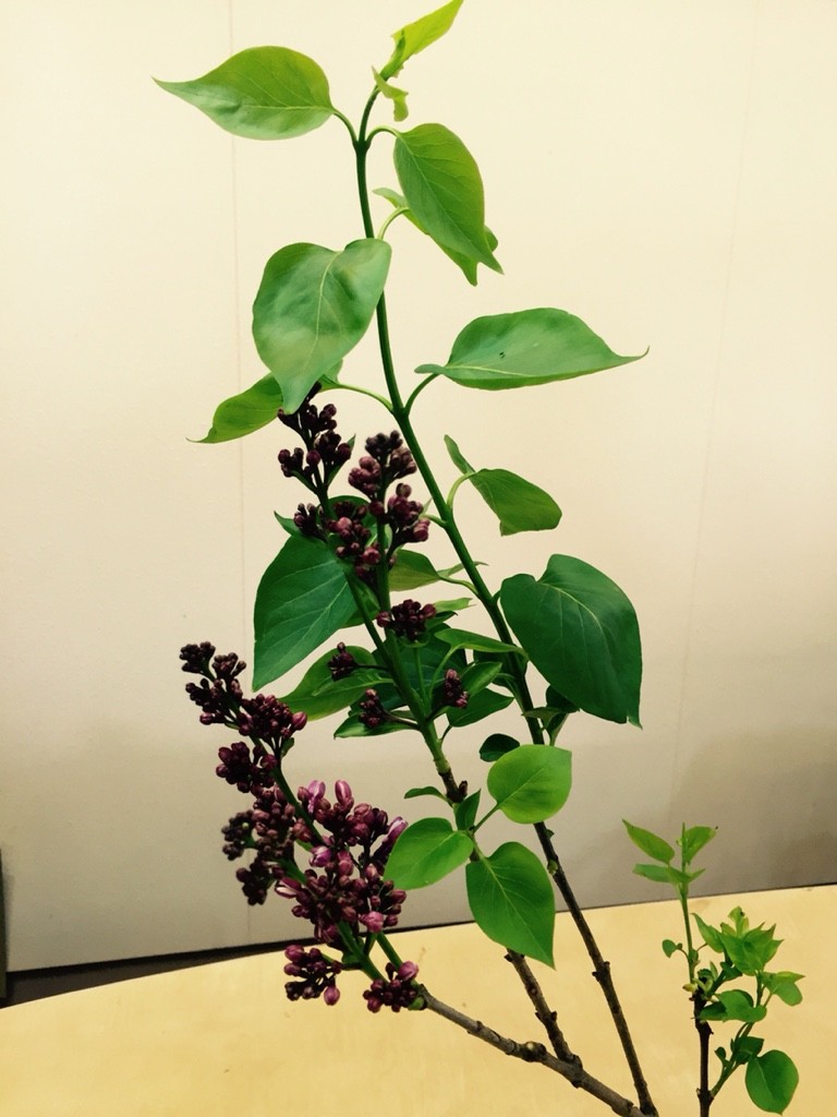 花のひとふさ、葉のグリーンの違い。ボタニカルアートに描きたくなるようなリラの花と枝。