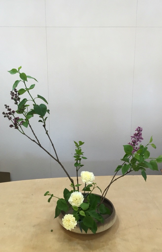 第三応用立真型 盛花でライラックとレモンクリーム色のカーネーションを選びお稽古しました。