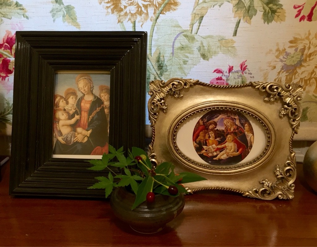 実家でもらった桜の実の小枝を、紅葉とともにいけてみました。