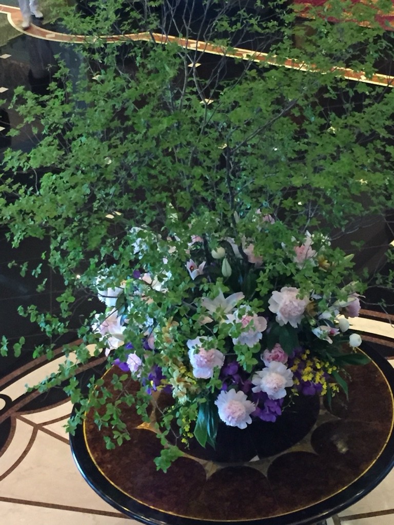 芍薬のロビー花が見事ですね、ピンポン菊(緑)百合、ドウダンツツジの新緑と華やかかつ今の季節のお花