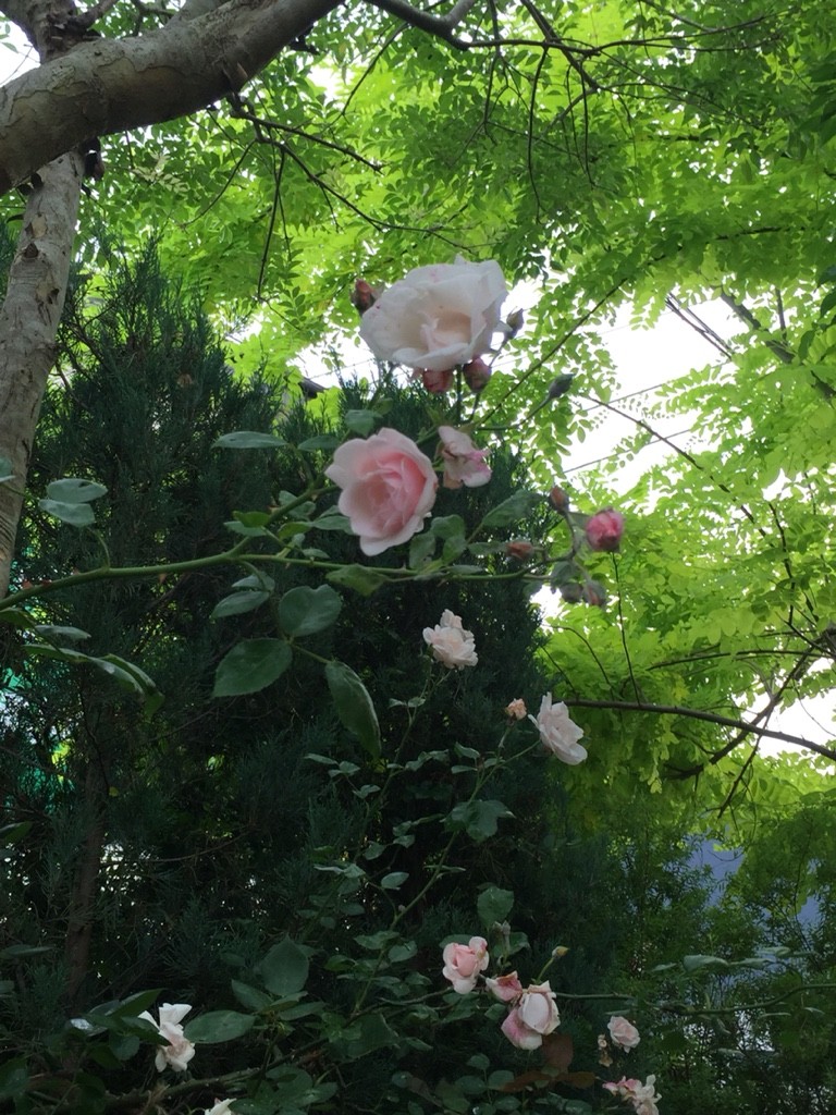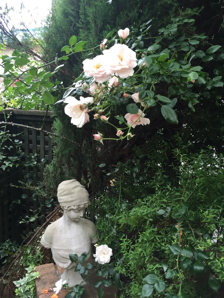 ニュードーンのつるが伸びて、庭の南側のほぼ枝と花で囲まれるようになりました。