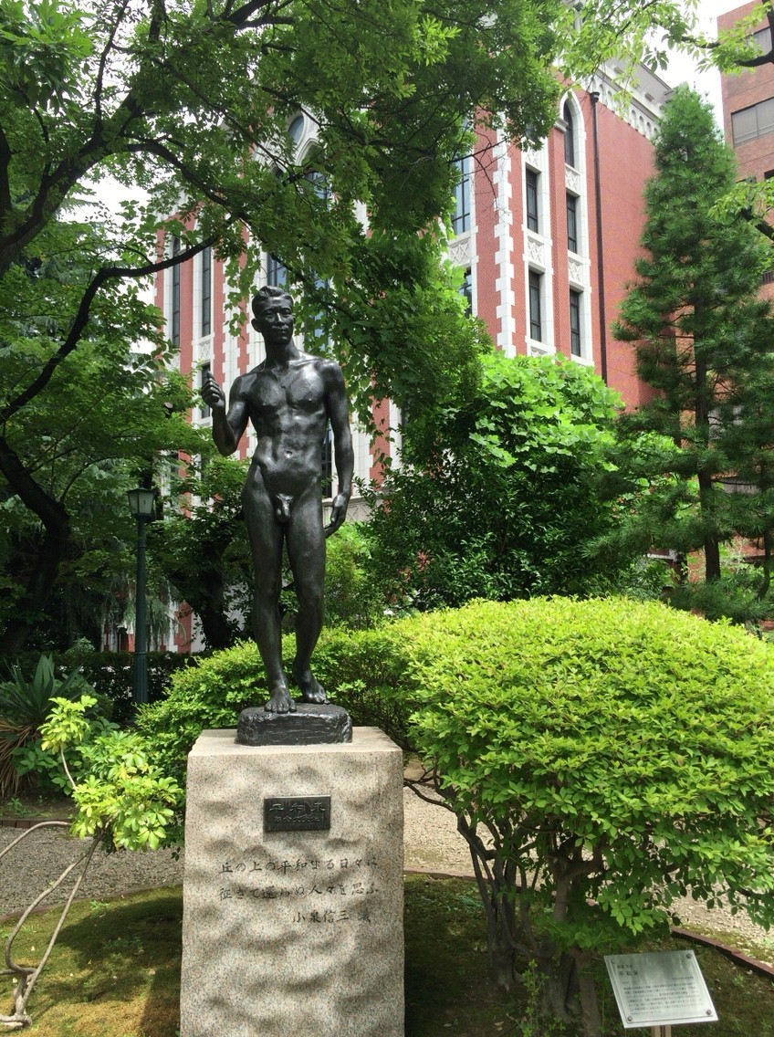 台座には、戦時中塾長であった小泉信三の碑文が刻まれている、若々しい青年の姿は、還らぬ尊い命を偲ぶとともに、新しい平和の時代に未来を担うべき者たちを励ますようにキャンパスの学生をみつめている。