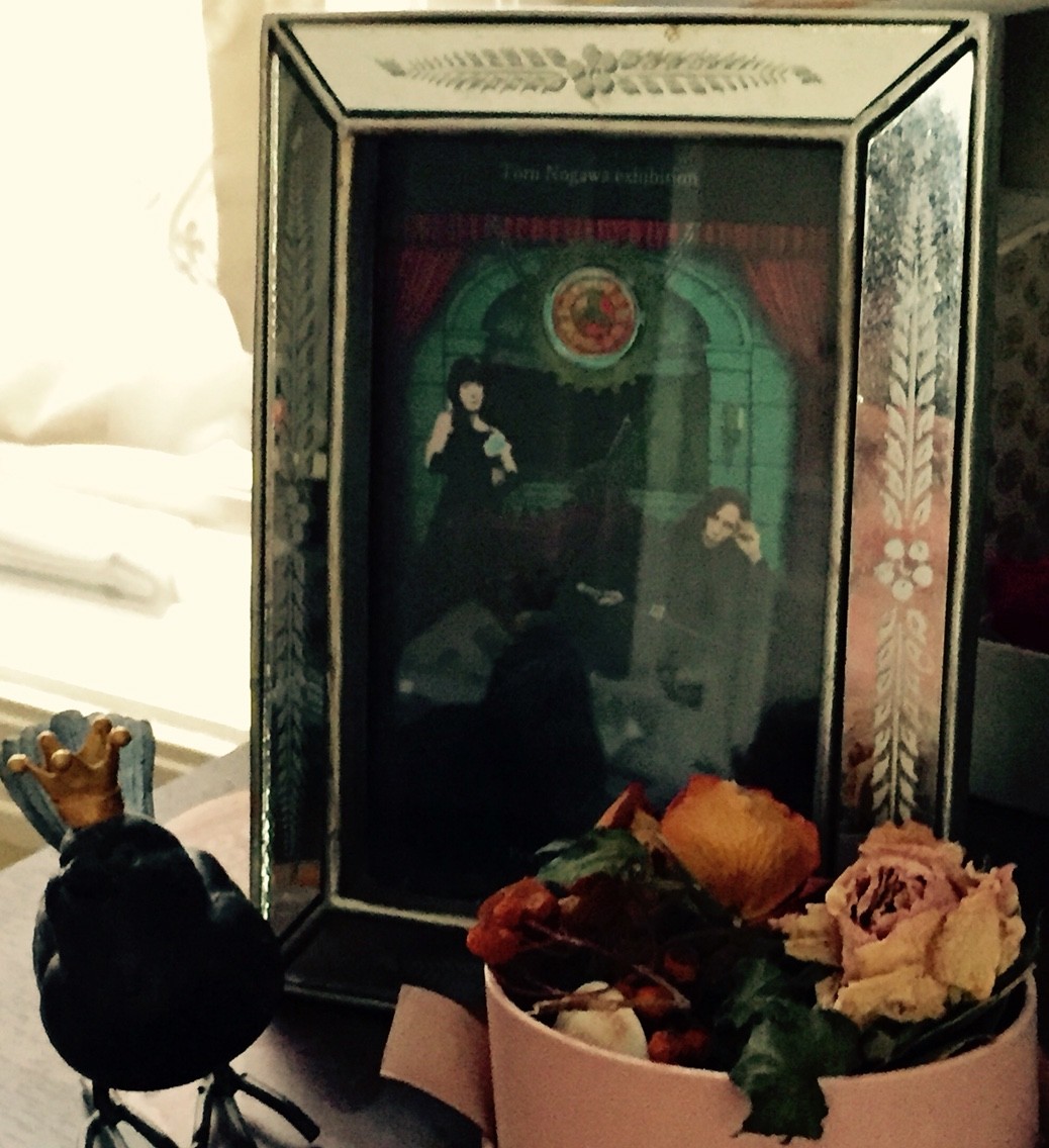 自宅のばらを小箱につめたドライフラワーボックスを作っていますが、Nogawaさん(画家)から頂戴した展示ご案内のお葉書をフレームいれてみました。