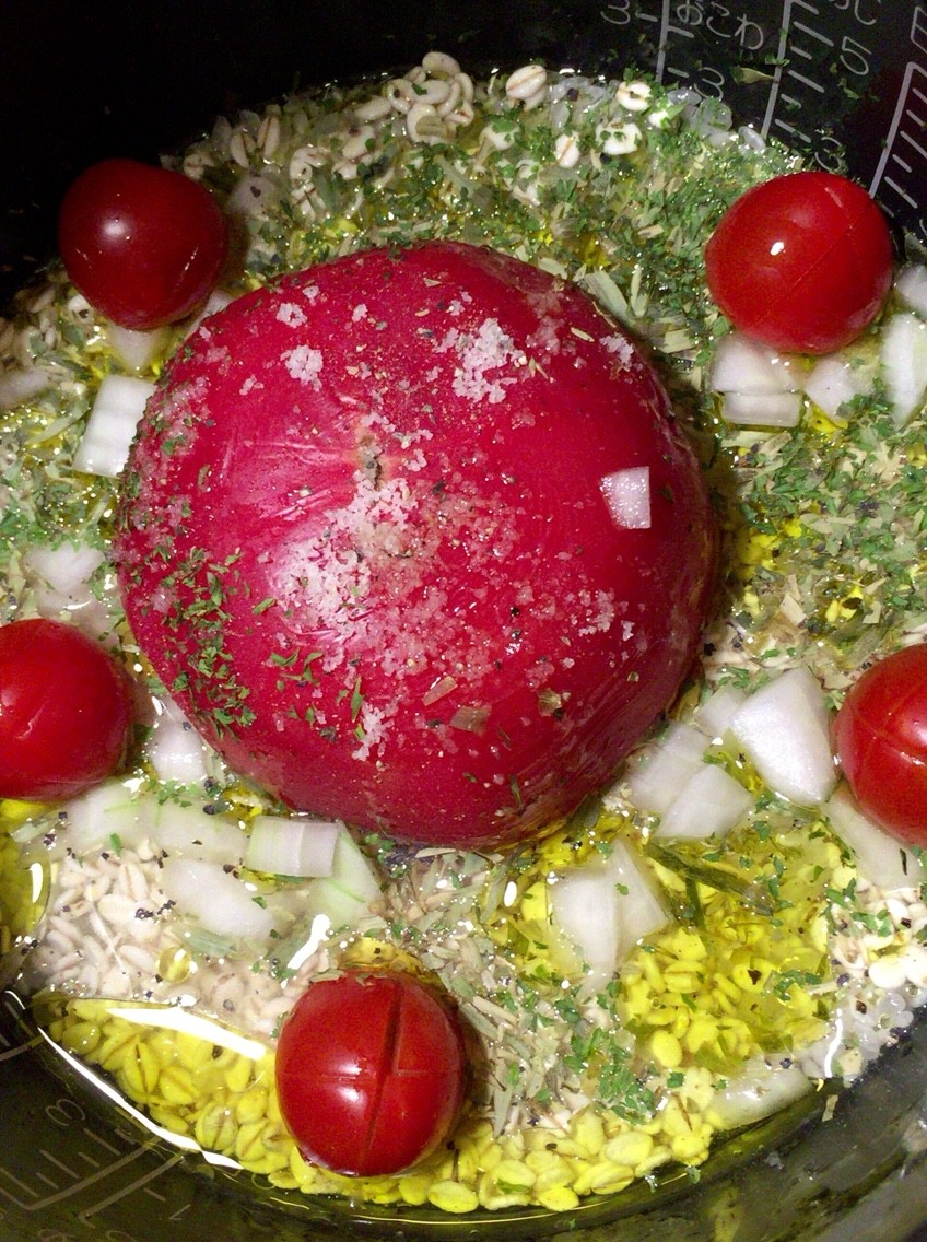 参考にしつつ、オリーブオイル、タラゴン、パセリ、ゲラントの塩とトマト大1、ミニトマト5個を配置して炊飯。麦もいれました。それから玉ねぎの荒いみじん切りすこし。