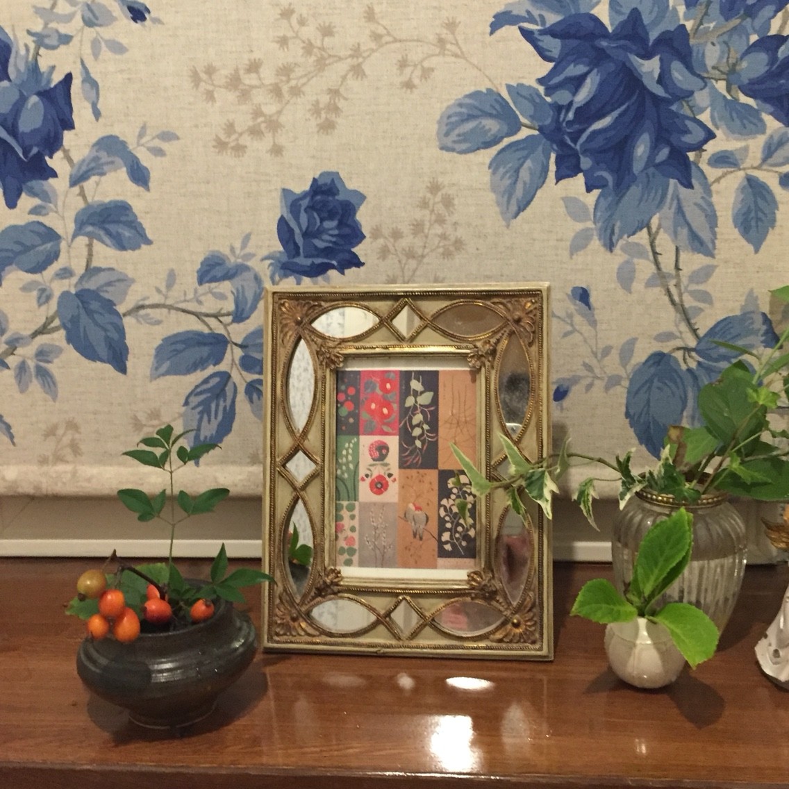 二階のヴァニティに、すずばら、南天ほかいけなおしまして、フレームの絵を弥生美術館で購入したカードに変えました。