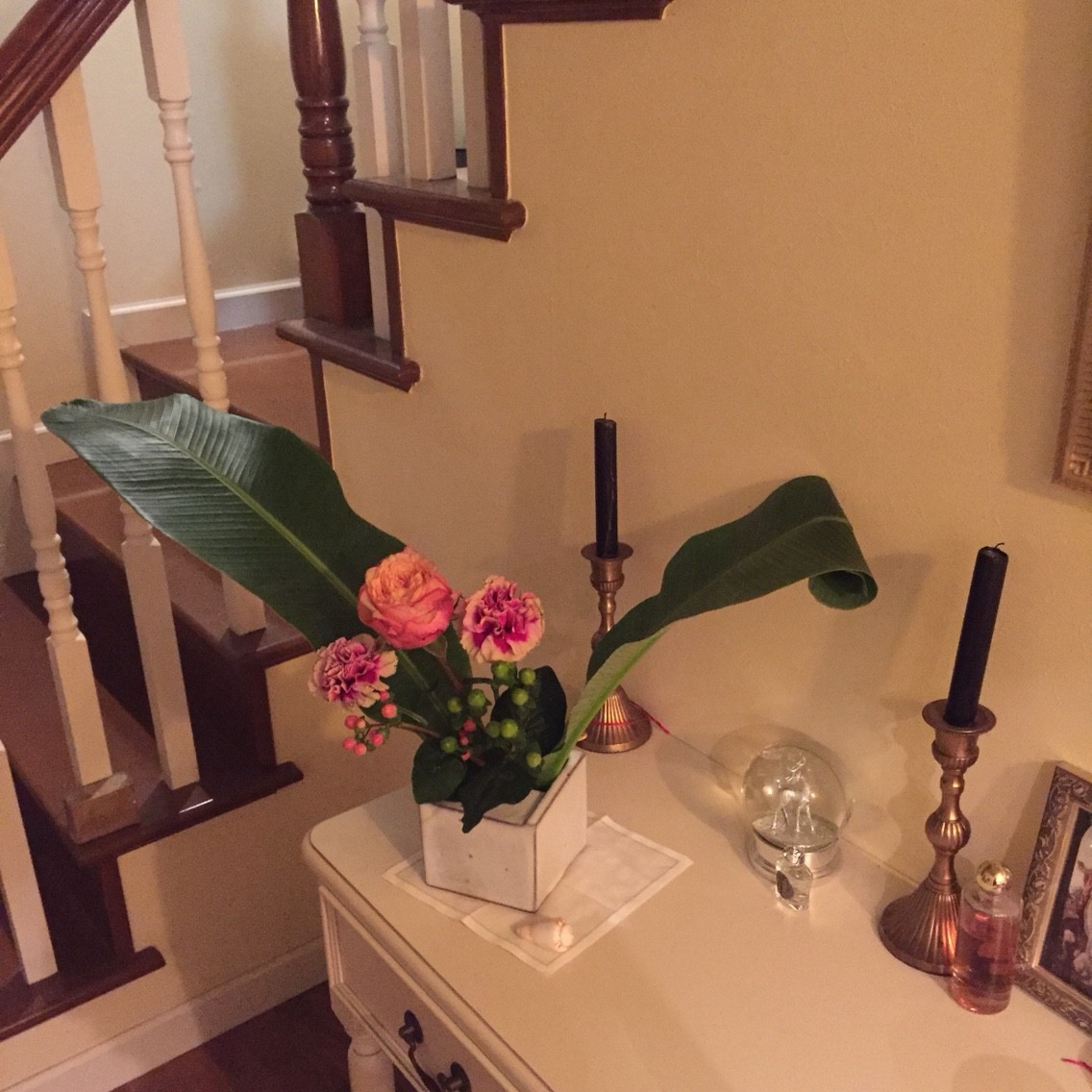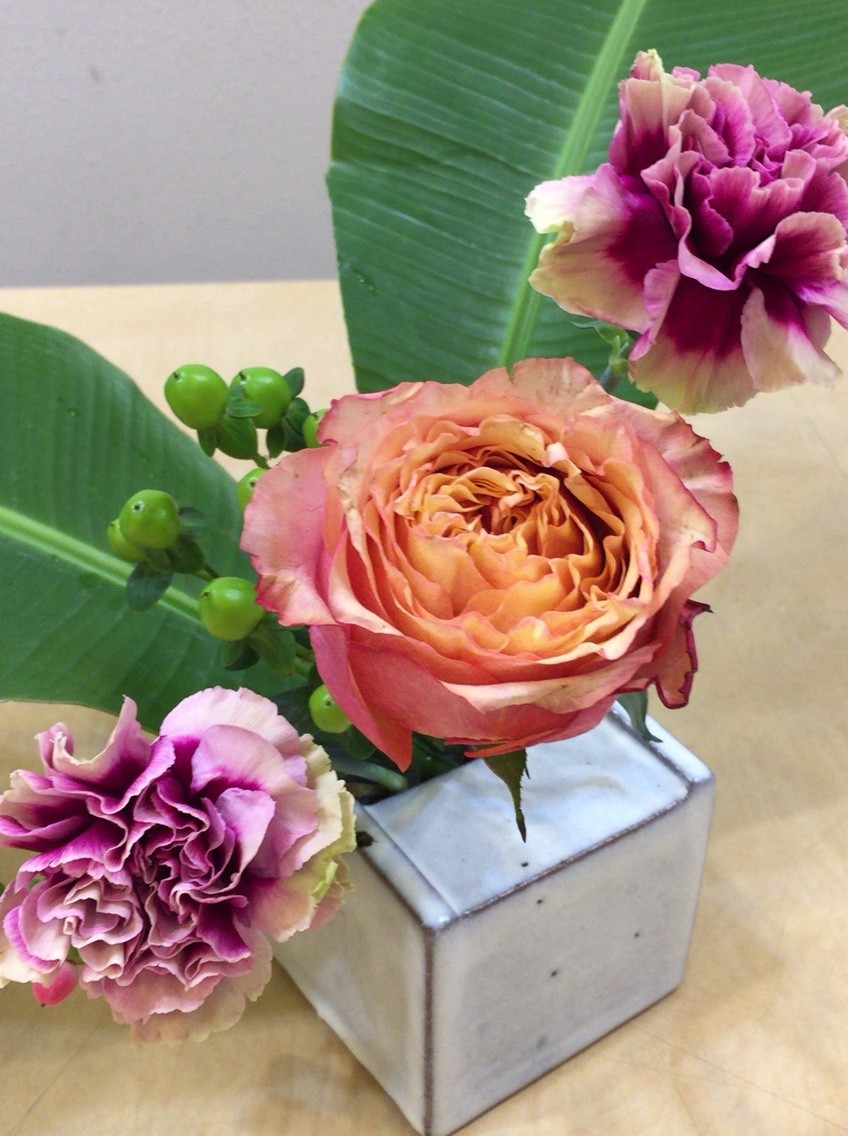- いけばな(草月流)お稽古 自由花+スケッチ ばら、芭蕉、カーネーション、ヒベリクム、草月陶房花器”いろり”